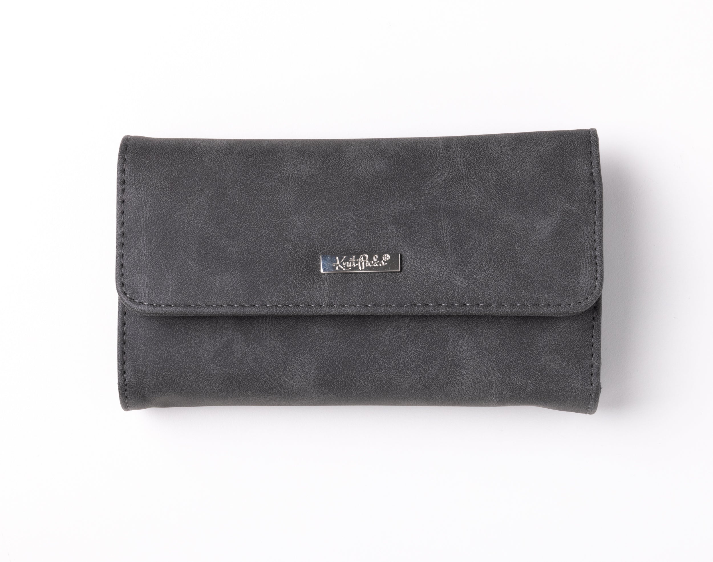 Small black faux suede clutch, 30 locking metallic stitch markers, 4 black end caps, 2 cable keys, and cable connectors