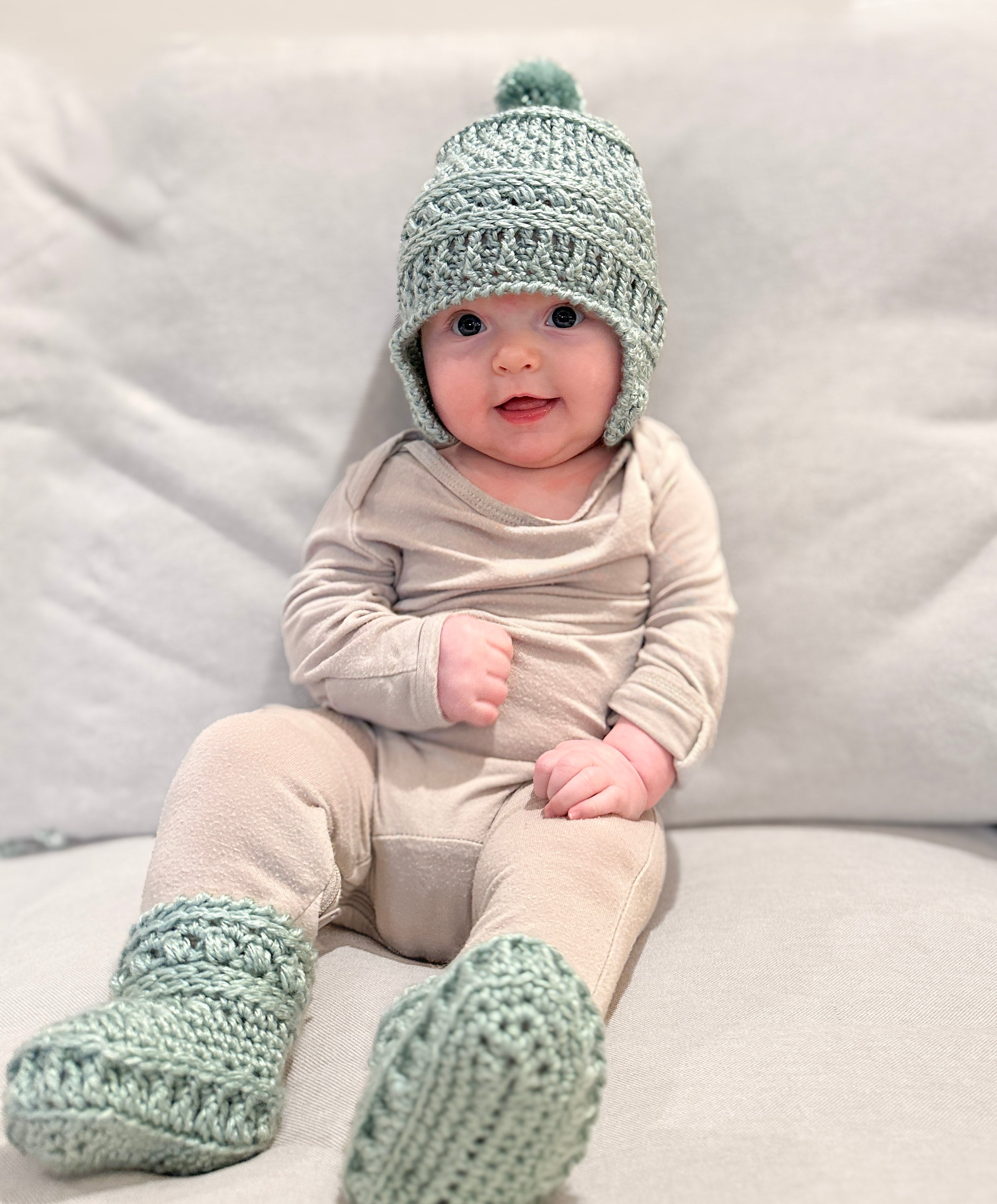 Perfect for soft cuddles and tiny hops, the Bunny Hop Hat & Booties set was crocheted with care using Jimmy Beans exclusive Beanstalk Worsted yarn. With sweet bunny ears and cozy soles, this adorable duo keeps little toes and heads warm through every hop, skip, and giggle! Perfect for storybook adventures, it’s the perfect touch of charm and comfort for your little one.
