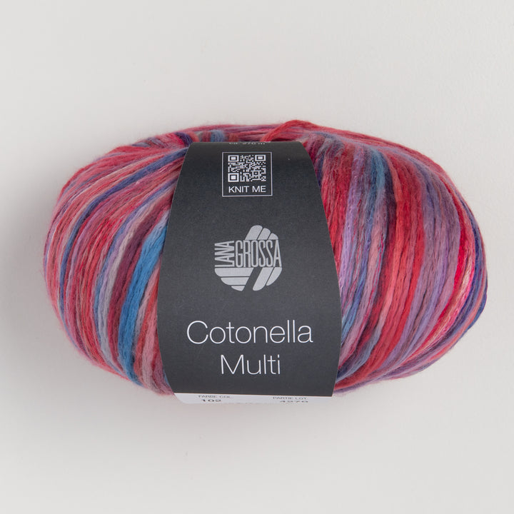 Lana Grossa Cotonella Multi brings elegance with a playful twist! This yarn features a subtle print effect, gently combined with delicate highlights that add a touch of shimmer. Its unmercerized Pima cotton alternates beautifully with shiny threads, creating a seamless transition into voluminous warp yarns. The result is smooth, refined knitting pleasure with just enough texture and sparkle to keep things interesting. Perfect for those who want to add a bit of flair to their projects without the fuss, this yarn is ready to shine in any stitch!