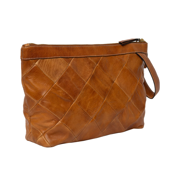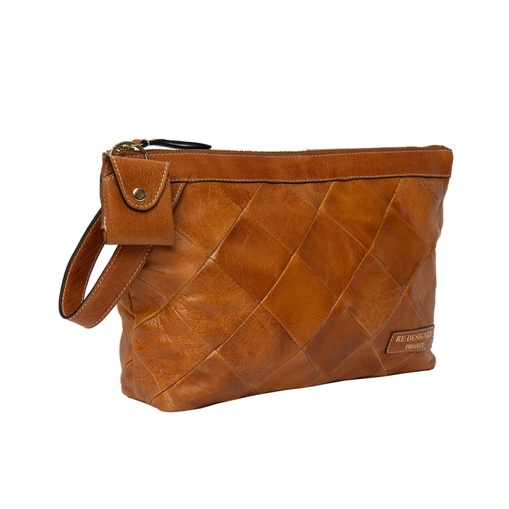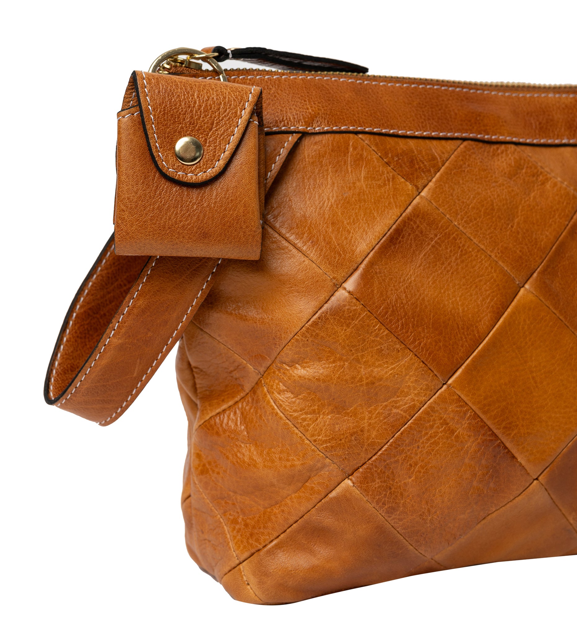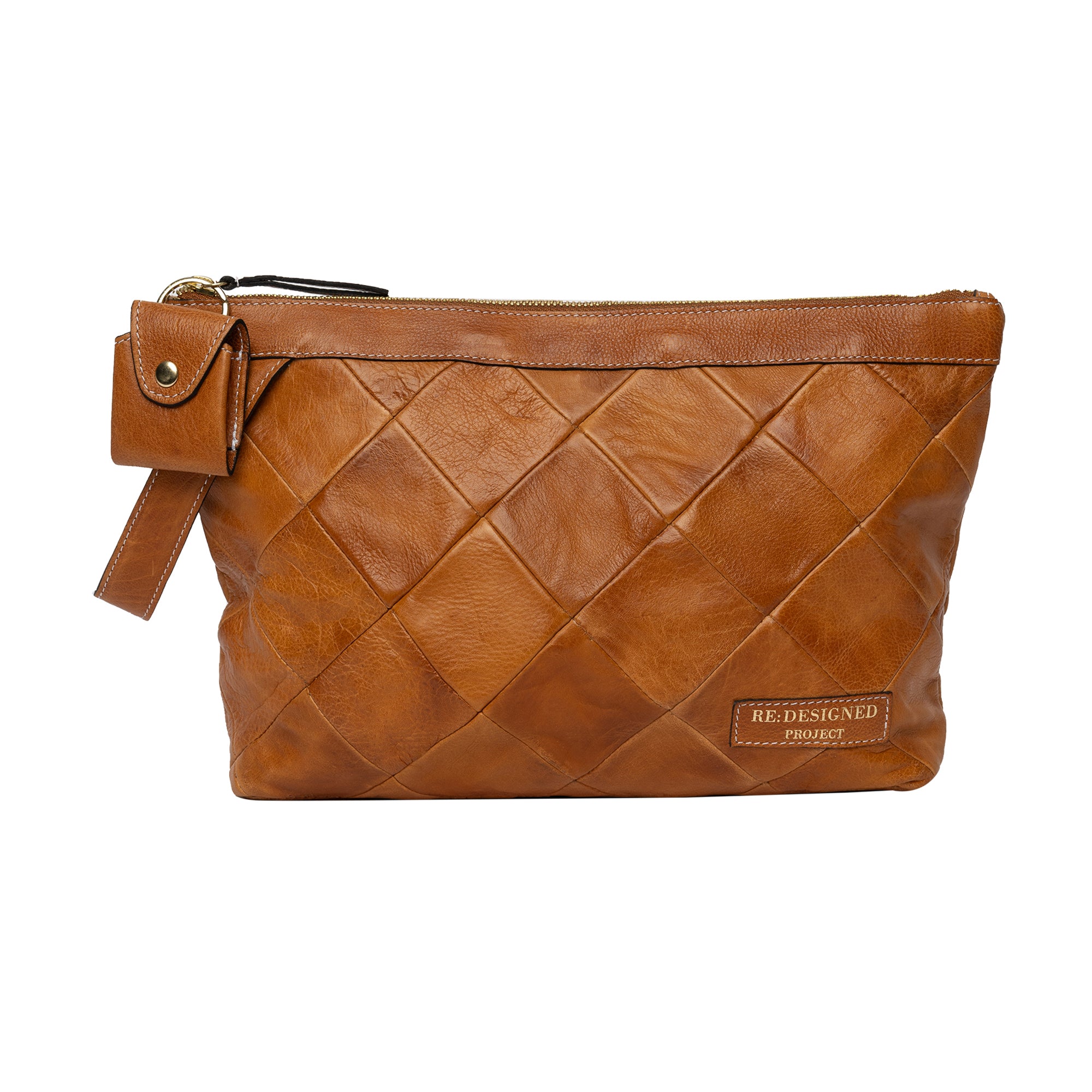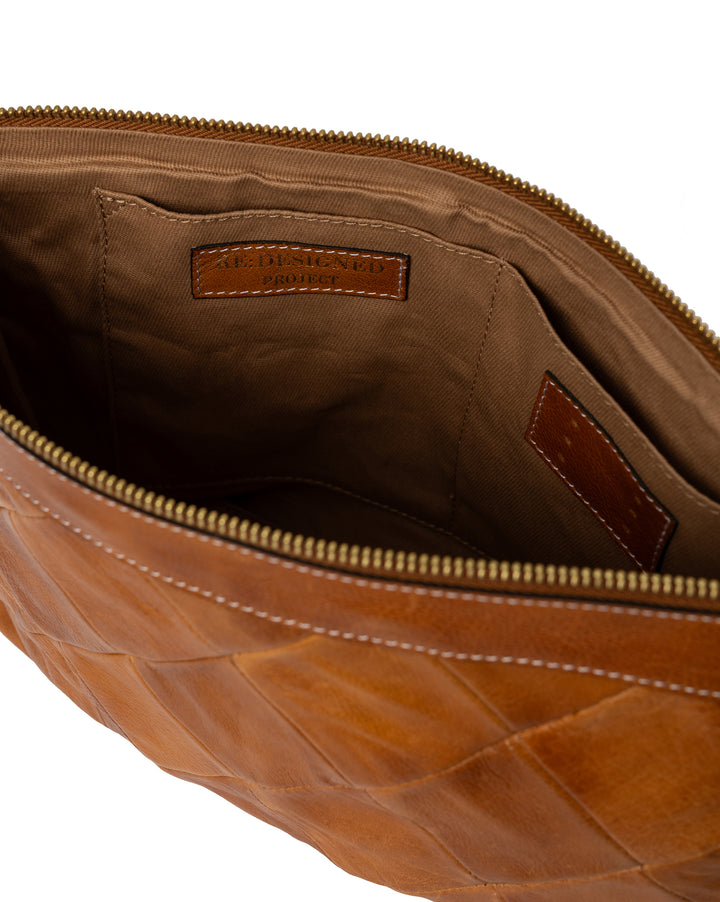 Dive into sustainable luxury with Project 17, a spacious clutch pieced together from scrap leather to form a stunning quilt pattern! This bag offers ample space for a small project, yarn skeins, and all your making essentials. Inside, you'll find four deep pockets perfectly sized for needles and accessories, complemented by a sleek metal zipper to keep everything organized and secure. Its got a handy side handle and a cleverly designed keyring for your measuring tape, too! Made in Urban quality naturally colored cow leather, each clutch boasts a unique pattern, dyed and lightly waxed by hand for a soft, natural finish.