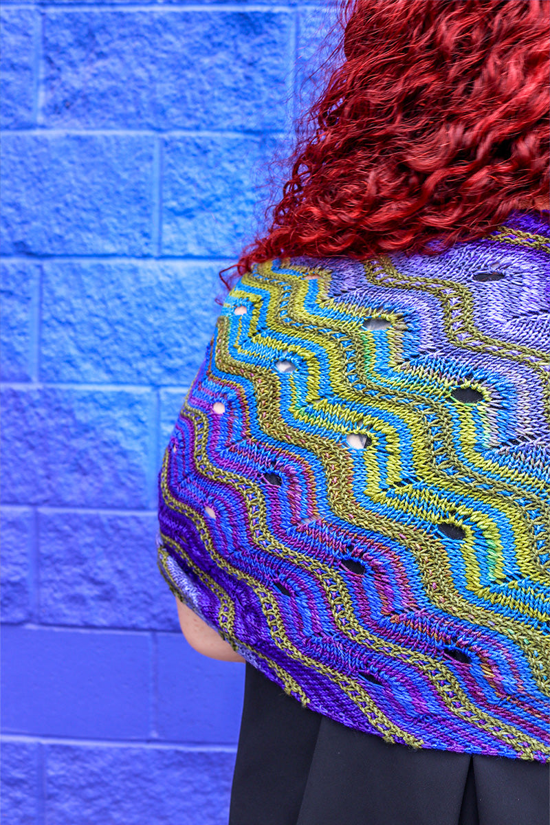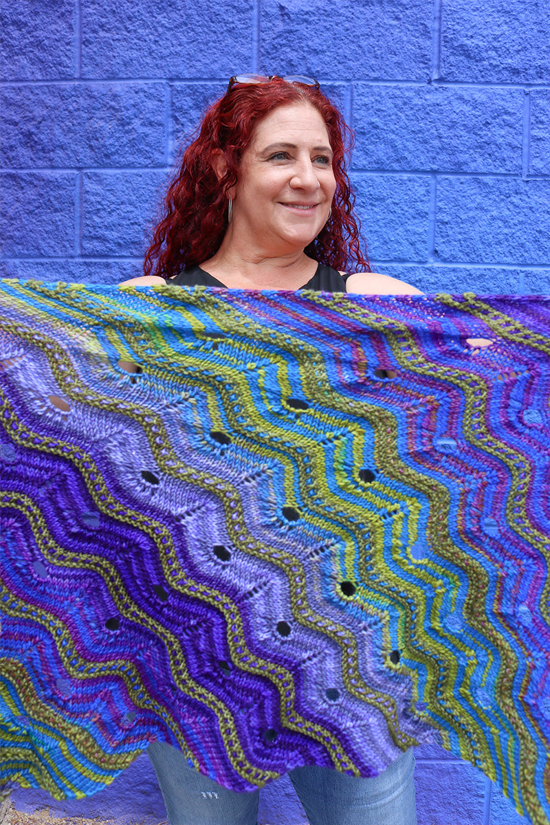 Get ready to embark on a journey with the Adventuresome Wrap! Frequent color changes in the lace and slip stitch sections make this knit addictive and will keep you wanting to knit on!