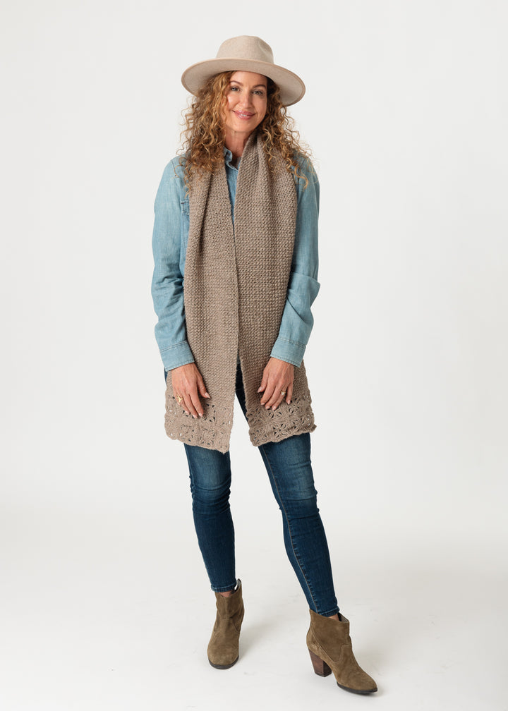 Harvest Glory Scarf from Yarn Citizen features two rows of fun motifs on either end. Crocheted in Yarn Citizen Affinity, a gorgeous sport-weight alpaca, this generously sized scarf will keep you warm on all of your autumn adventures!