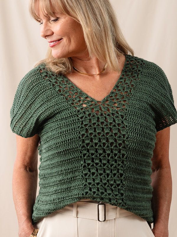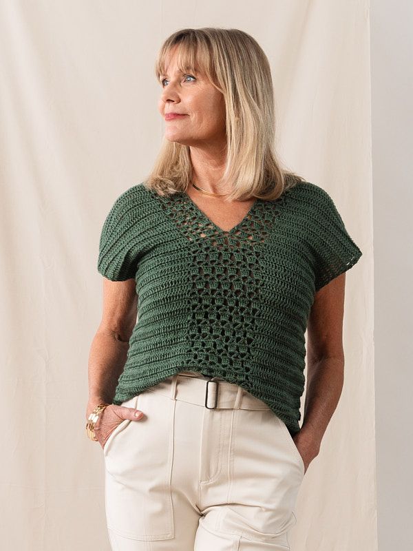 Meet Lowell—the effortlessly chic crochet top that’s ready for anything! With a sophisticated yet laid-back vibe, this modern classic features a gorgeous center lace panel, a flattering V-neckline, and an easy drop-shoulder silhouette. Crocheted in Modern Linen, it’s light, breathable, and perfect for staying cool while looking polished all summer long.