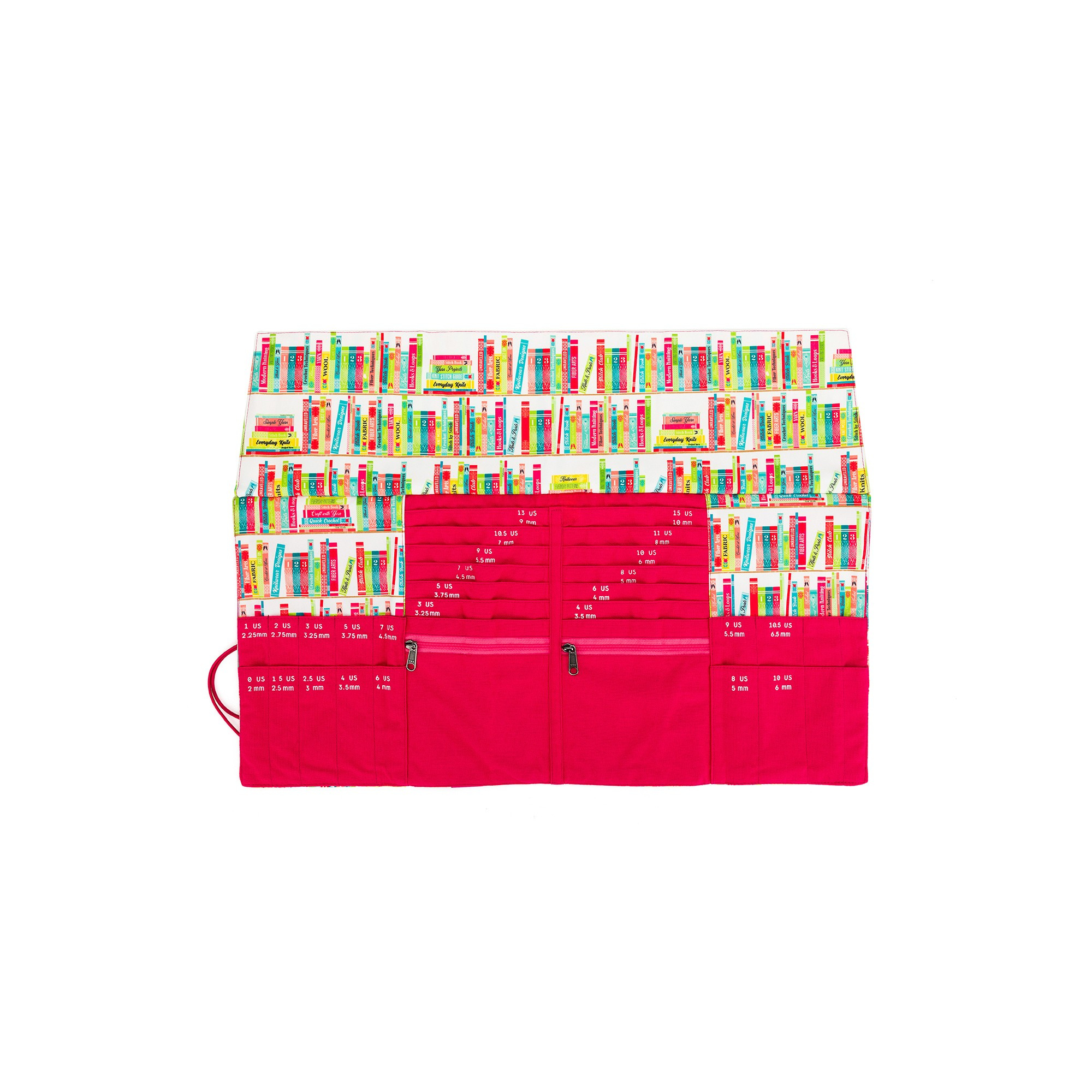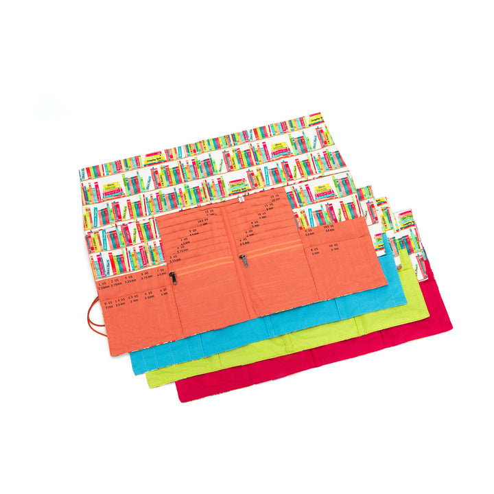 The della Q Circular and Double Point Case feature a quad-fold design to securely hold one complete set of DPNs (Double Point Needles) and multiple pairs of circular needles! This case includes twelve numbered and two unlabeled pockets for circular needles, as well as thirteen numbered, and four unlabeled pockets for DPNs up to US size 8. There are unlabeled pockets for any extra DPNs or circulars, and it includes two small zip pockets for notions!