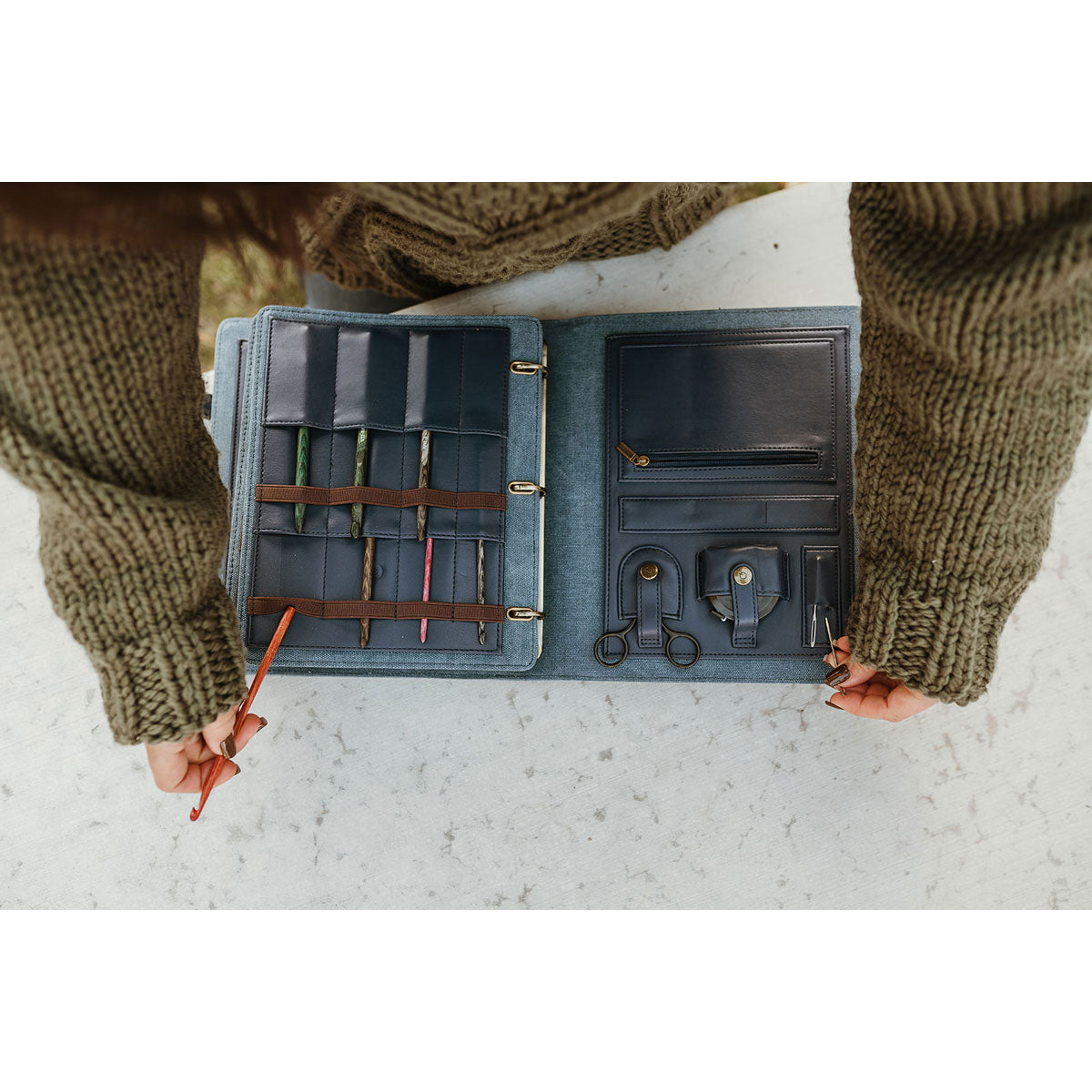 Meet the della Q Hook & Needle Notebook, your all-in-one craft storage solution! Crafters often switch between knitting and crochet projects, and this stylish notebook keeps your crochet hooks, knitting needles, notions, patterns, and more organized. It comes with four essential pages for your tools, including a built-in zippered pouch. Plus, you'll find darning needles, a tape measure, and scissors all included. Color-coordinated and designed to match della Q's Everyday Collection, it's the perfect crafting companion for ALL makers!