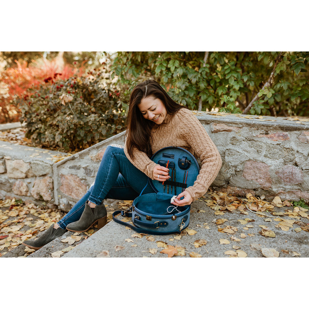 Thoughtfully designed with nine pockets to neatly organize your needles or crochet hooks, you'll also find an integrated tape measure, scissors, and darning needles in matching pockets securely attached to the top lid. Take your projects with you in style!