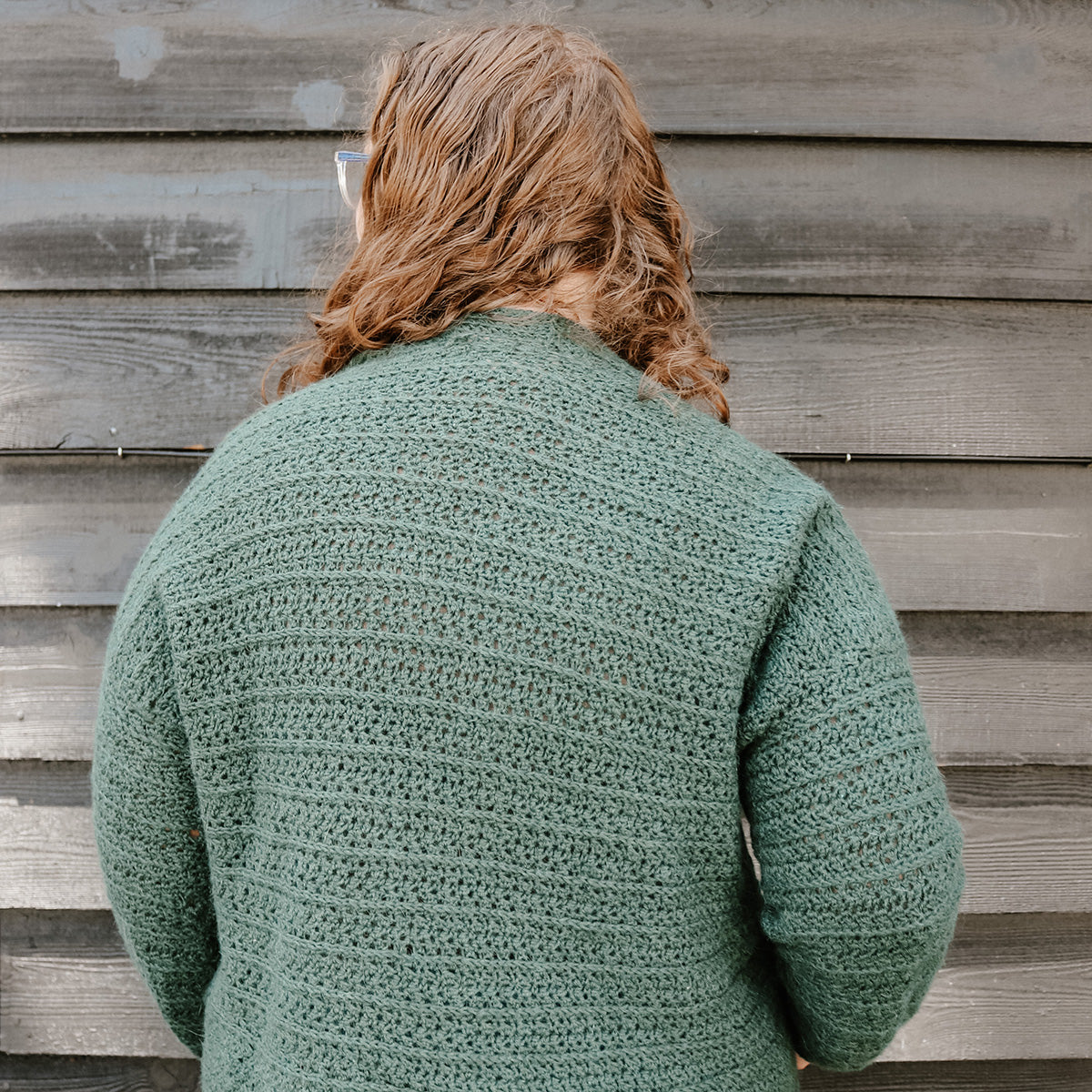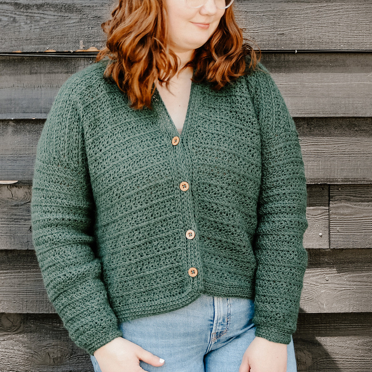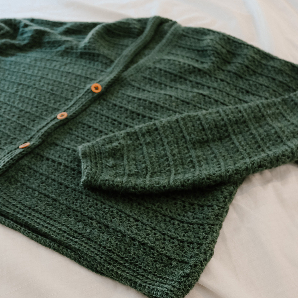 Our Bean Elizabeth made the cutest and coziest cardigan to wear this fall in Yarn Citizen Harmony DK in the color Evergreen! Designed by Grace Lehman, the Forager Cardigan is an elevated take on a basic wardrobe staple. The stitch combination of classic ribbing and lovely textures creates a charming and chic pattern! This is an easy and mindless project that works up quickly.