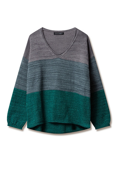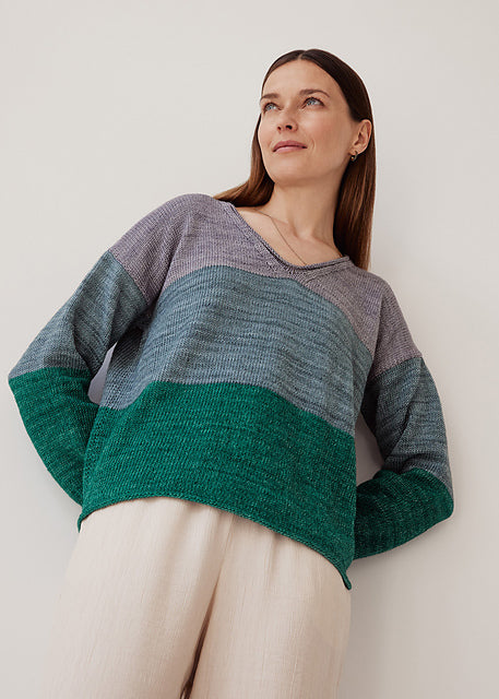 Made with Lana Grossa Cool Wool Vintage, this V-neck pullover features bold wide stripes and an oversized fit for ultimate comfort and style. The roomy silhouette gives it a laid-back, effortless vibe, while the vibrant stripes add a fun, modern twist. Cozy, chic, and easy to wear, this pullover is perfect for making a bold statement while staying warm and comfortable!
