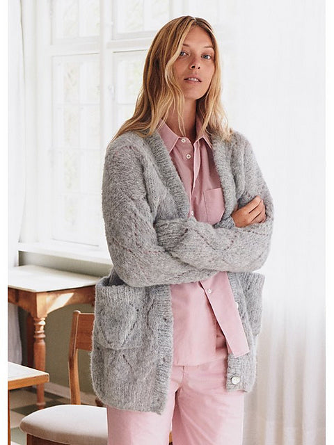 Elevate your style with this fabulous cardigan! Featuring playful buttons and convenient patch pockets, it’s perfect for keeping your essentials close. The delicate eyelet design creates a stunning diamond-shaped pattern that brings a charming touch to any outfit. Made with luxurious Lana Grossa Natural Alpaca Lungo, it’s cozy, cute, and bursting with personality—a must-have for your wardrobe!