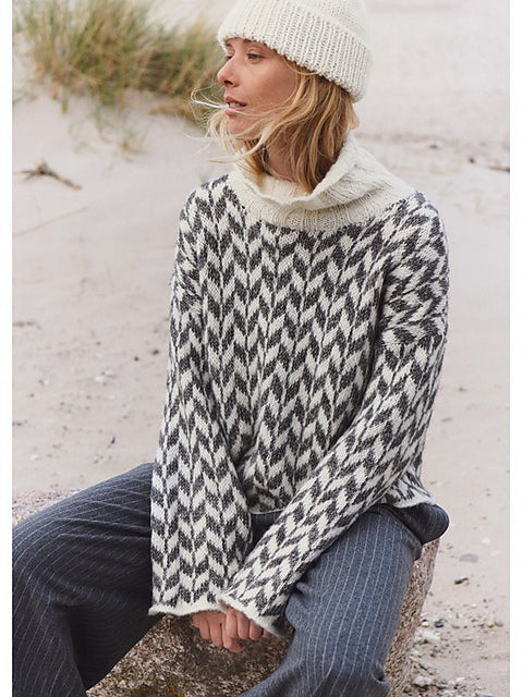 This roomy-fitting pullover is your ultimate choice for effortless style and warmth! With a relaxed turtleneck collar, it offers both comfort and elegance. The stranded colorwork creates a stunning jacquard pattern that's sure to turn heads and add a vibrant touch to your look. Worked flat from the bottom up and crafted with the luxurious Lana Grossa Natural Alpaca Pelo, this pullover is perfect for those chilly days when comfort and style come together beautifully!