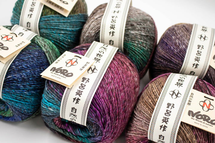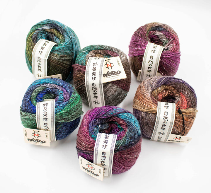 Meet Tasogare from Noro! This Aran/Medium weight yarn features Noro's signature blend of coriedale/merino, silk, and mohair. Tasogare is similar to Noro's other popular yarns like Silk Garden. However, the meaning of Tasogare reveals the inspiration - Japanese for "twilight," that time when colors grow dim as light fades - this yarn features undyed dark brown wool, which interplays with the dyed fibers in typical Noro multi colors. Each color gives a more muted & deep feeling such as one feels at the end of the day when the brightness of the sun fades. Each dragon egg ball contains over 400 yards of yarn, enough for a small shawl or accessory!