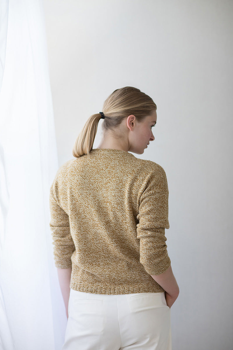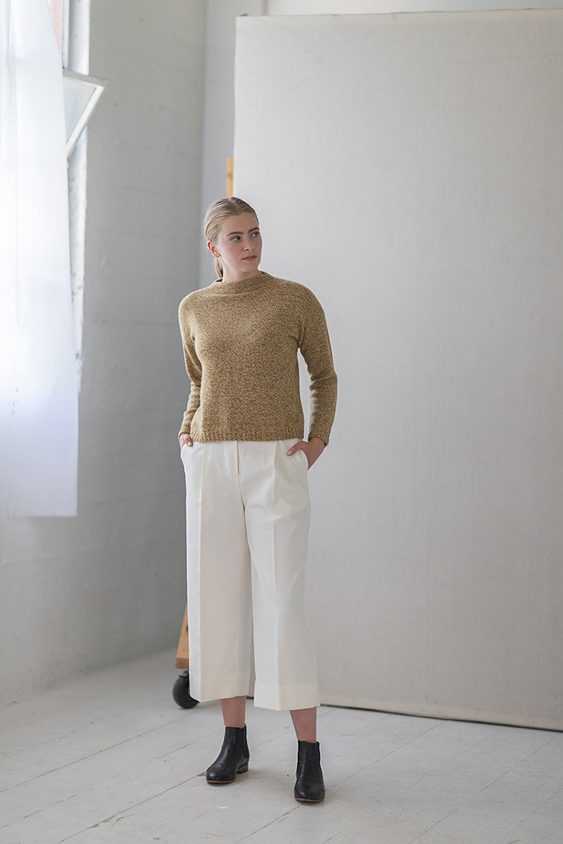 Ren is the reason you're looking for to knit with Woolfolk's Sno yarn! The marled nature of the yarn is beautiful in this understated sweater, which is a great project for beginners, by the way! Body and sleeves are knit flat from the bottom in stockinette stitch with ribbed edges. Though this sweater is shown modeled on a woman, this is a great sweater for men, too!