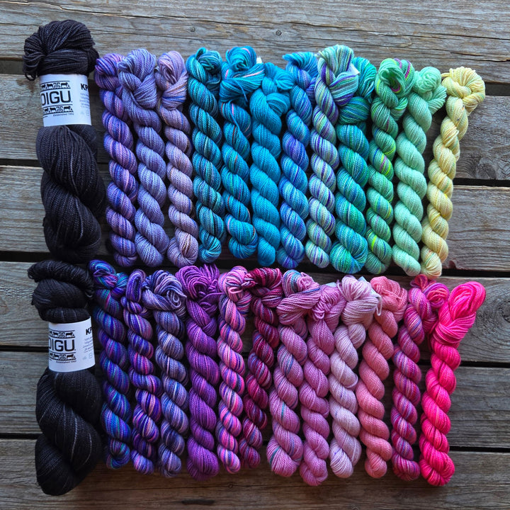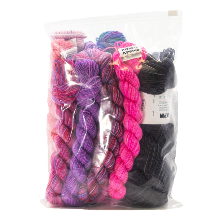 Choose between a 5 or 12 skein set of 25g KPPPM mini skeins, each paired with a 100g contrasting skein of KPM for striking colorwork. Whether you prefer a colorful gradient or bold contrast, these yarn sets provide everything you need to create a stunning hand-knit shawl.