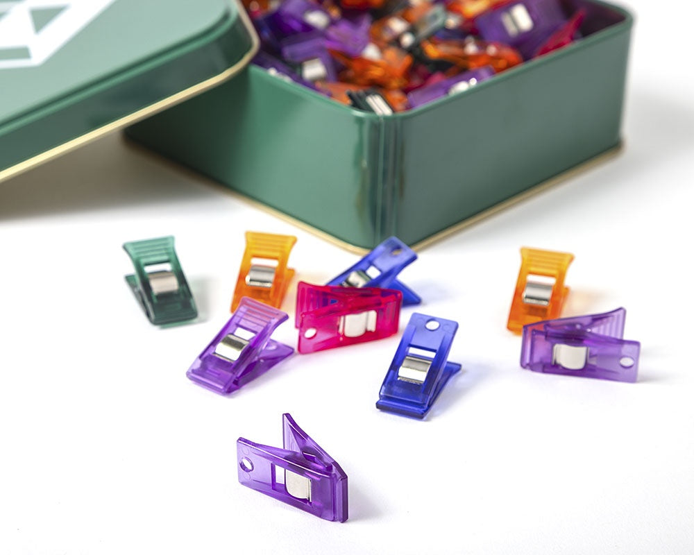 Perfect for holding your fabric in place, including binding! Our Quilt Clips open wide and are a great, more secure alternative to pins. They have a flat base and come packaged in a decorative metal tin.