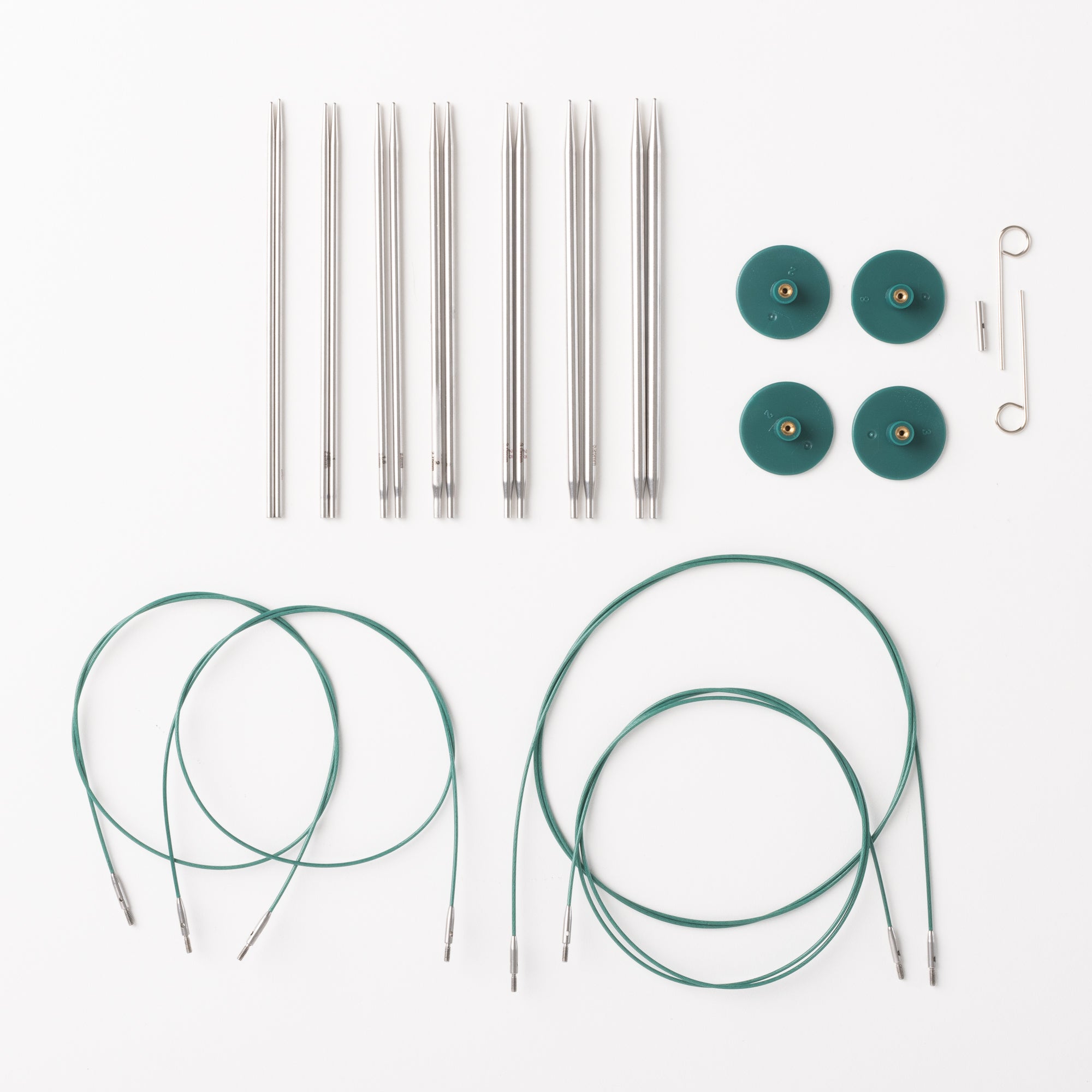 The Lace Options Interchangeable Needle Set is designed with smaller gauge needle tips in 7 sizes--US 0-4 (2.00mm-3.5mm)--that connect snag-free to an extra thin green cable, and our new signature green cables are now stronger than ever with a sturdy, nylon-coated steel cord. The new cords have the perfect amount of flexibility to avoid twists and tangles, and just like with our other cables, the smooth cable join lets your stitches slide around your knitting needles with no snags while the long threaded join ensures that your cables and knitting needle tips stay securely in place. This set includes 4 lace cables--simply attach the needle tips to create 24", 32", or 40" interchangeable circular needles--perfect for lace projects and magic loop socks!