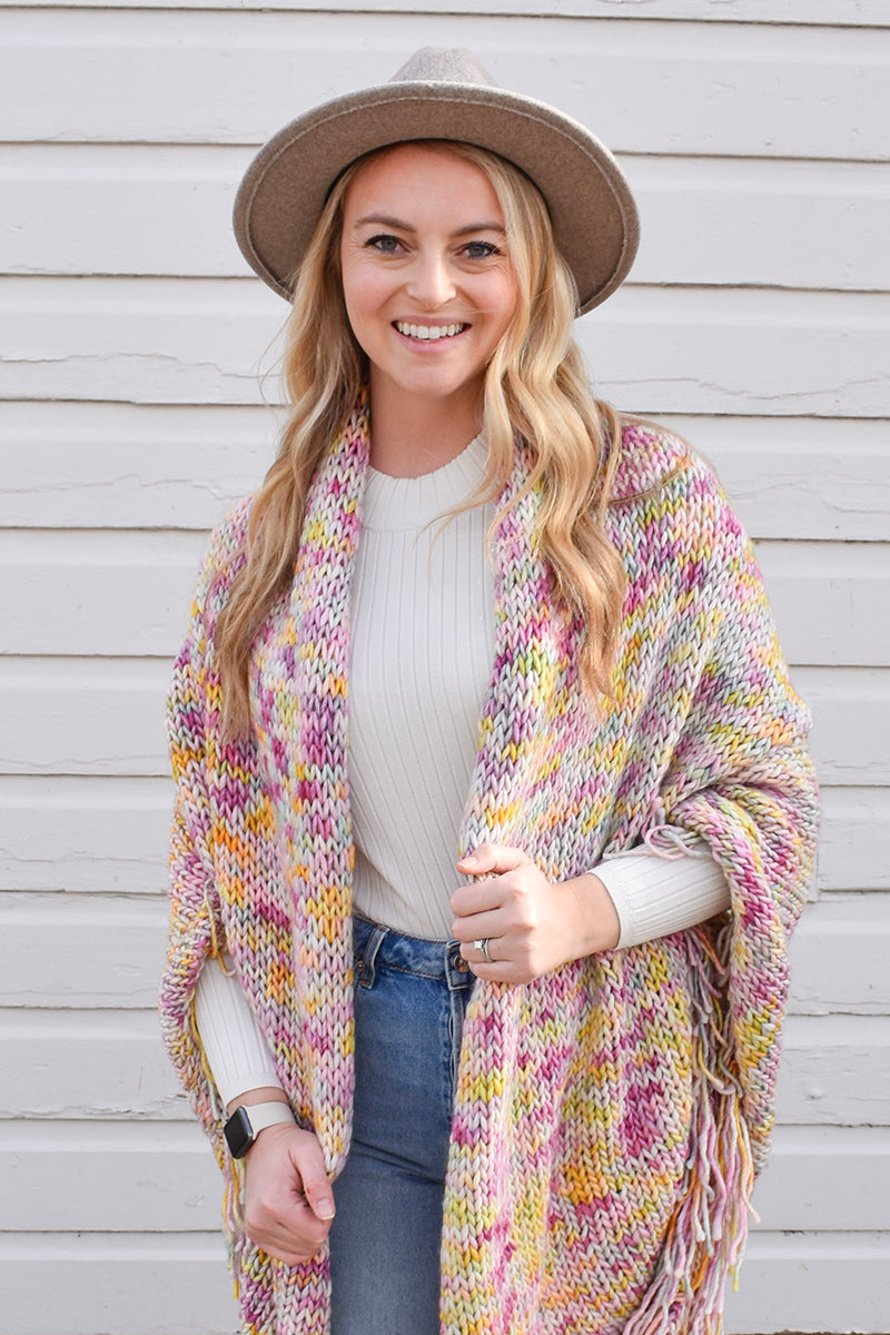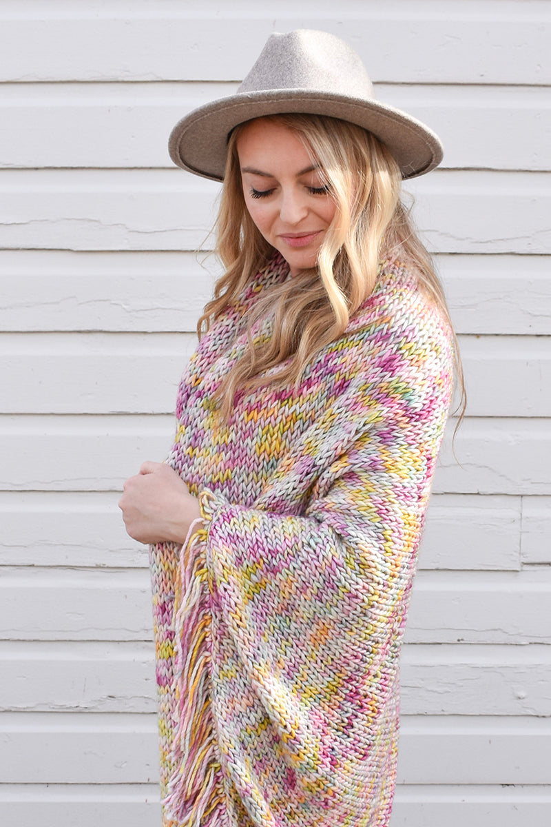 From the designer: Those of us who knit spotted the blanket that Carrie Bradshaw was toting around New York City in the series' recent spinoff, the large accessory comforting her before and after a medical procedure. What many didn't realize about Carrie's bold blanket was that it was actually an oversized, dramatically draped shawl. Big fringe, colorful yarn, and simple stockinette (with polished details) make this piece a must-have wearable accessory. And for those of us who don't have nearly $3,000.00 to shell out on the original, here's a perfect solution to knit one yourself!
