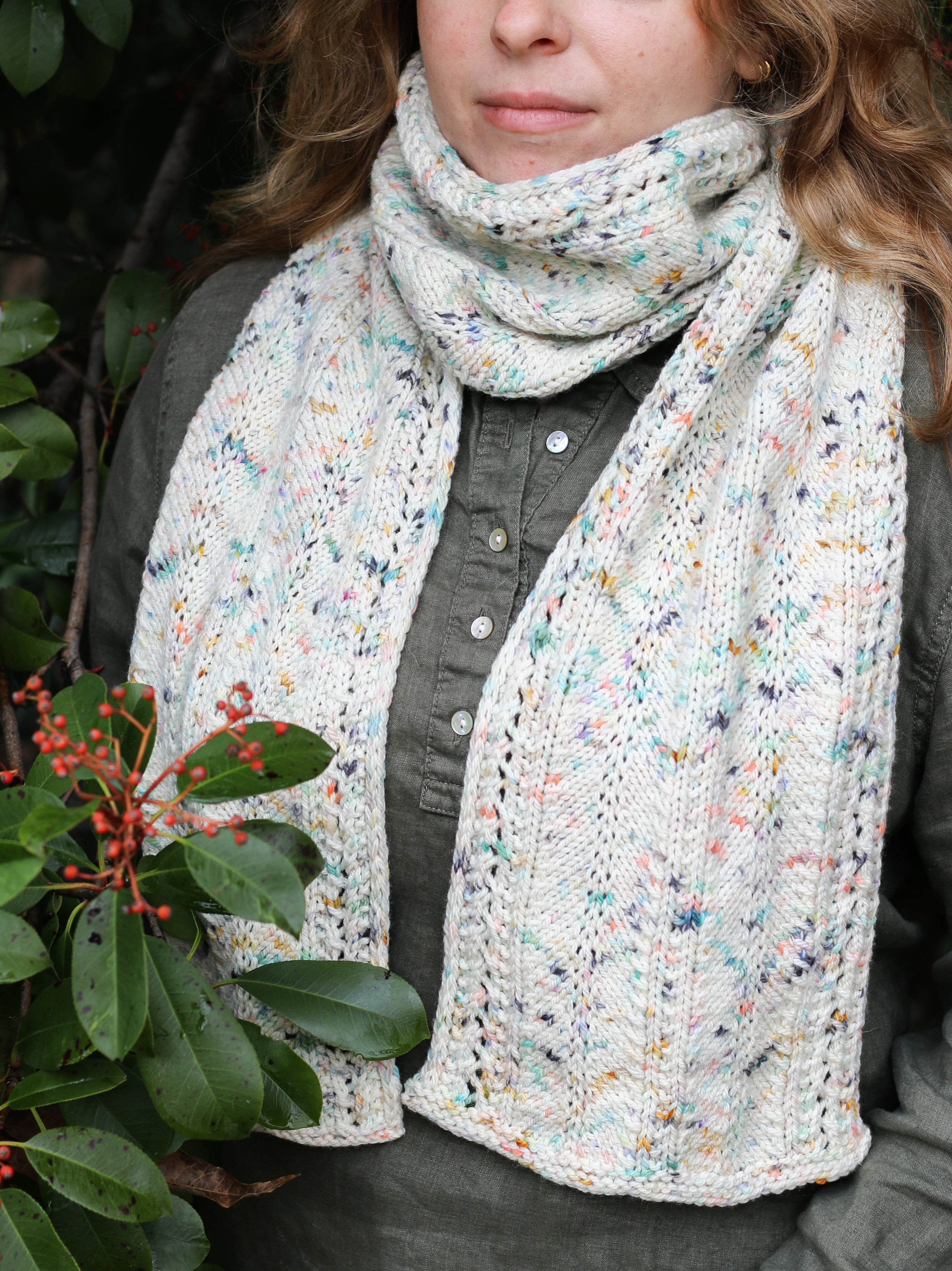 A generous scarf knitted in a faux cable pattern (no cable needles!) perfect for showcasing wild variegated colors. Designed specially as part of the Modern Daily Knitting x Madelinetosh Atlas collaboration!