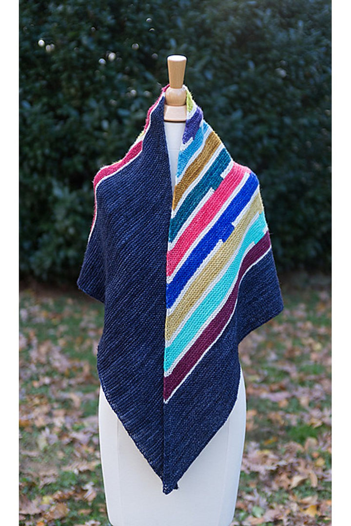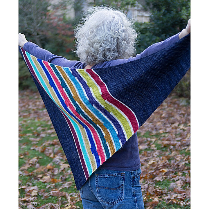 Pipes is a bias knit garter stitch shawl that is made up of two simple rows of knitting with increases worked at the start of every right side row. Just when you are ready for something more than rows of garter stitch, you begin the striped "pipe" section. Ten of the pipes have extensions that connect them to the next pipe. Extensions are worked over four rows using intarsia for color changes. The shawl is completed with a second main color section.