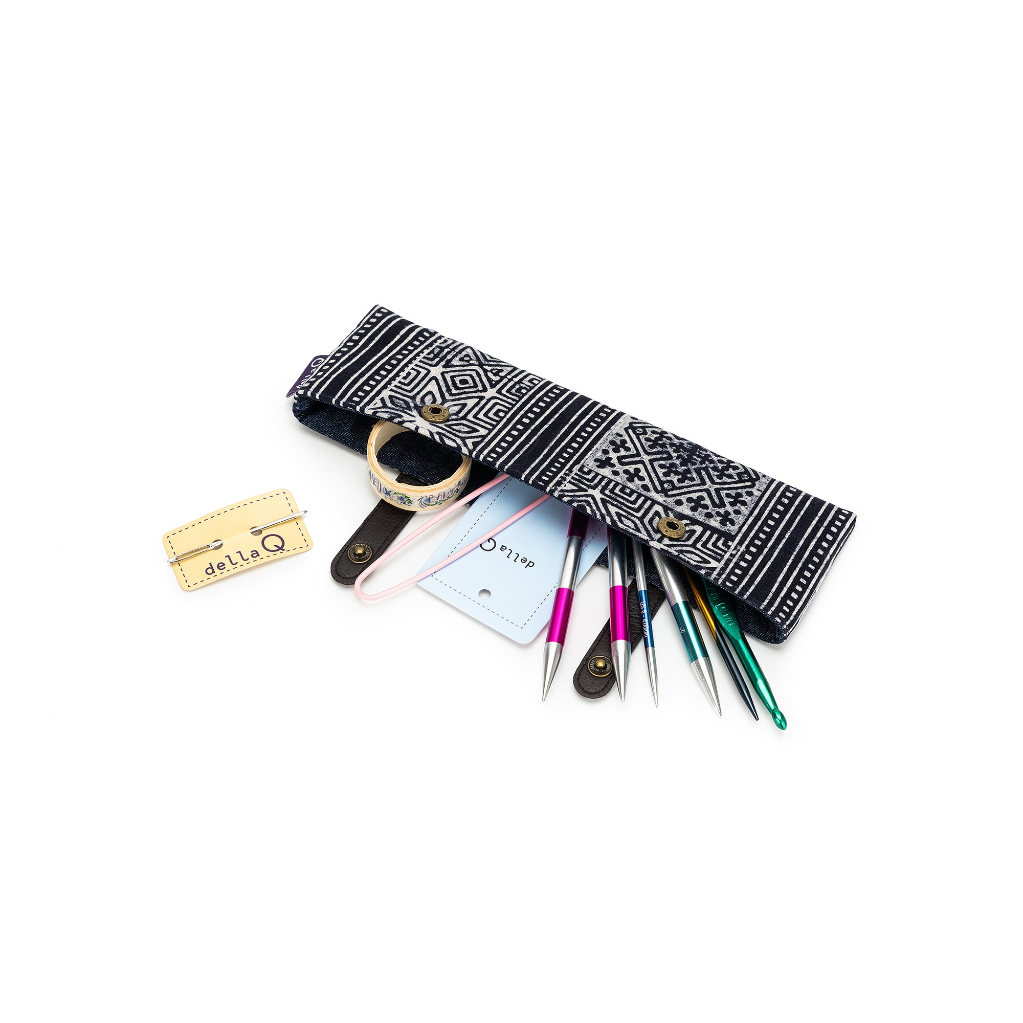 The lightweight and beautiful della Q Sock Needle Keeper - 1201-1 may be ideal for storing circular knitting needles or double-pointed needles (both sizes 6 and 8), but it's also perfect for storing your work-in-progress sock projects! Snap the pouch closed with two satisfying snaps and you'll never lose your stitches again!