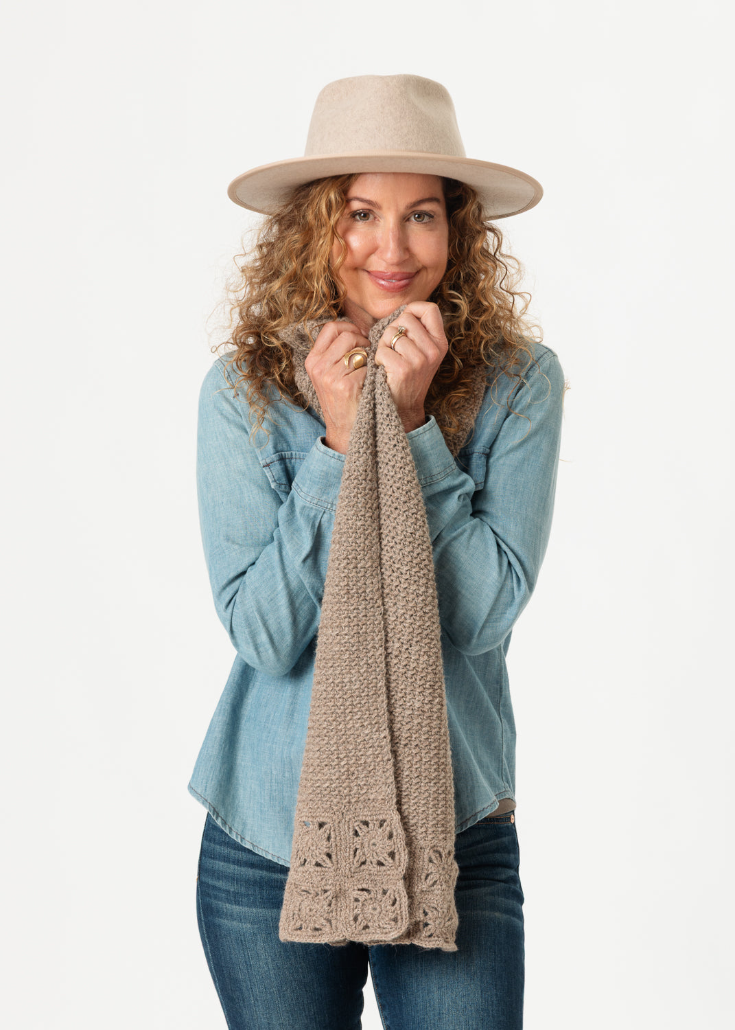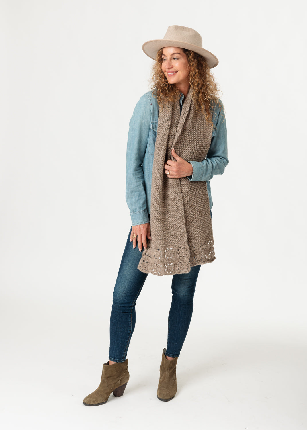 Harvest Glory Scarf from Yarn Citizen features two rows of fun motifs on either end. Crocheted in Yarn Citizen Affinity, a gorgeous sport-weight alpaca, this generously sized scarf will keep you warm on all of your autumn adventures!