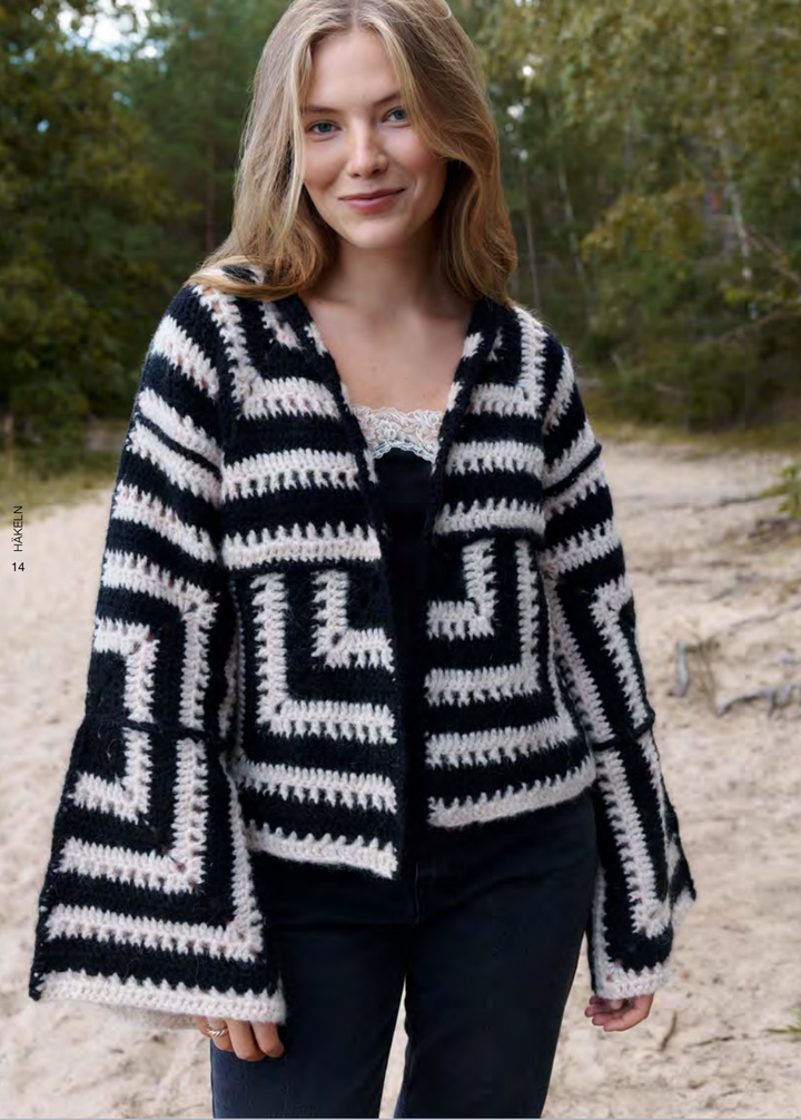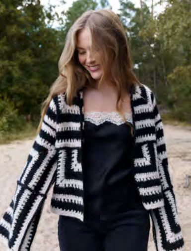 This crochet cardigan, made with the luxurious Lana Grossa Alpaca Air, is a bold and beautiful statement piece! Featuring striking mitered squares in bold black and white, it combines geometric precision with cozy charm. The bell sleeves add a playful, bohemian touch, while the soft Alpaca Air provides lightweight warmth. Whether you’re layering it over a simple outfit or making it the star of your look, this cardigan effortlessly blends modern style with comfort and flair!