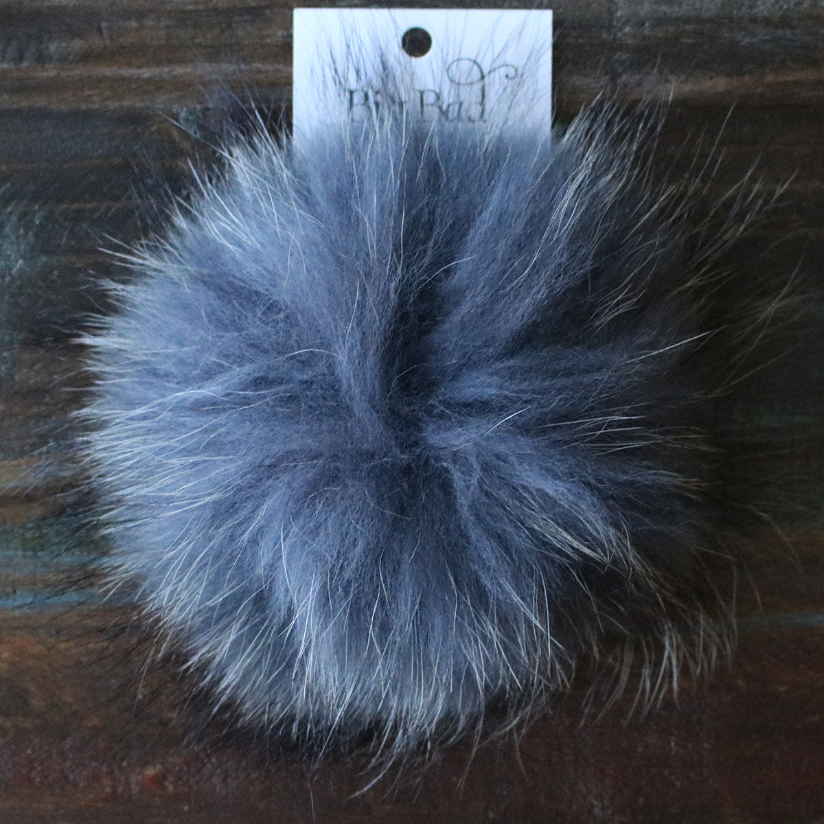 Large raccoon fur pompom with snap attachment for easy removal. Approx. 6". Grey