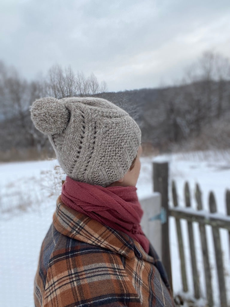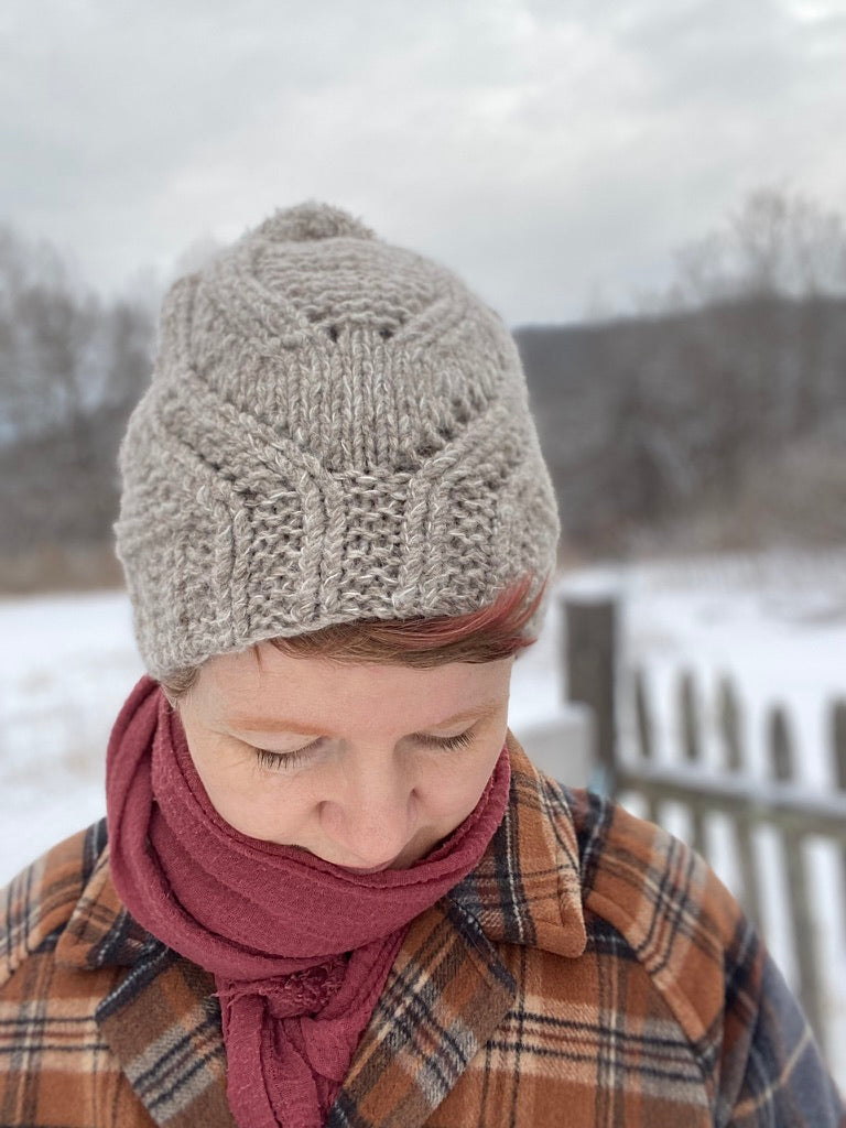 Gudrun Johnston first designed the Fidra Hat in 2015 while living in Edinburgh, Scotland. At the time, she nearly didn’t publish it—she wasn’t quite happy with the crown shaping. But after a few tweaks, she sent it out into the world and is so glad she did. Over the years, it has become one of her most popular patterns, finding its way onto needles season after season. Recently, she decided it was time to knit another for her own accessory drawer. This time, she paired Jamieson’s of Shetland Heather Aran with Yarn Citizen Trinity Cashmere, creating a beautifully textured, ultra-soft fabric—just the thing to keep the frigid New England temperatures at bay.