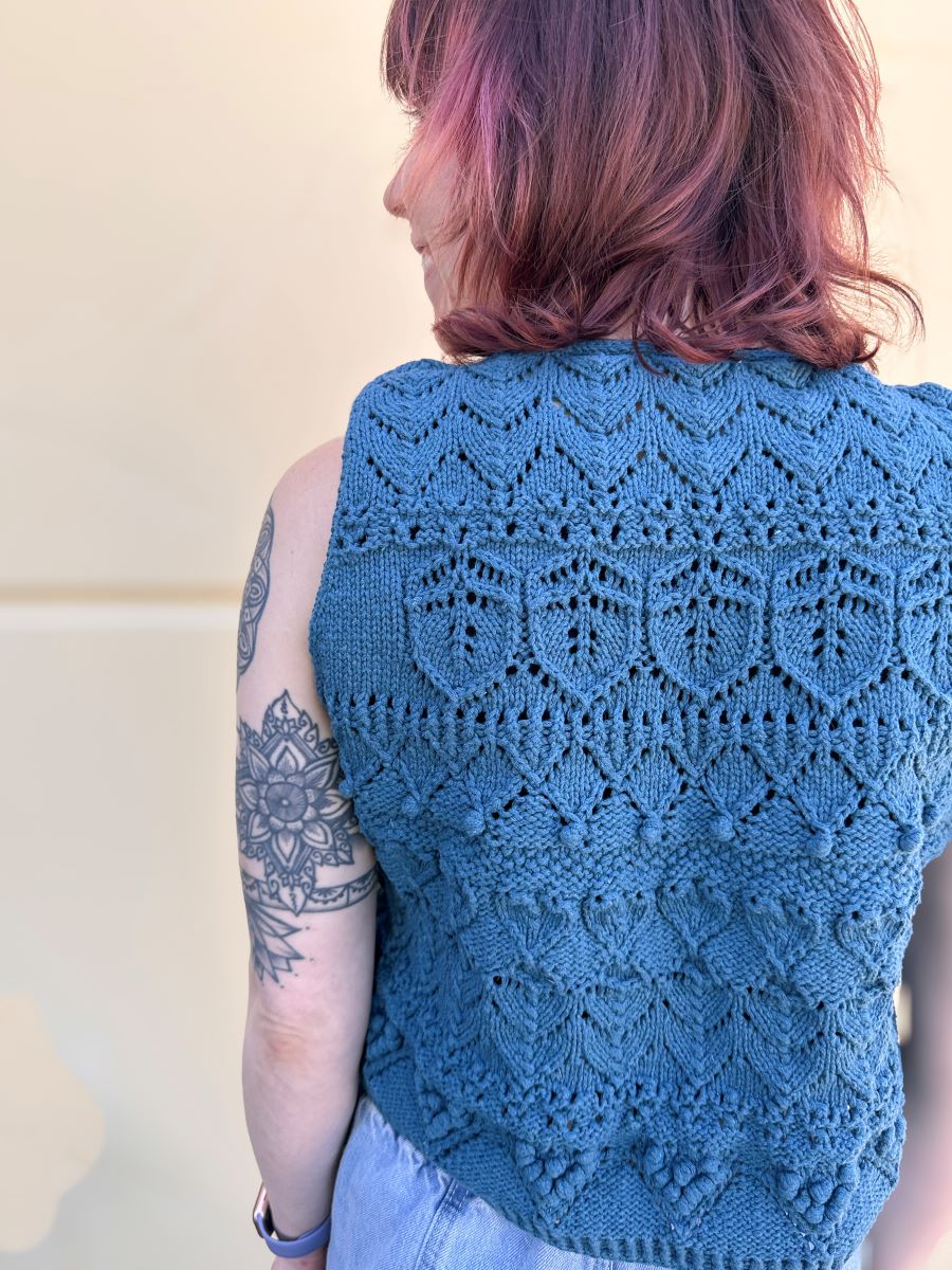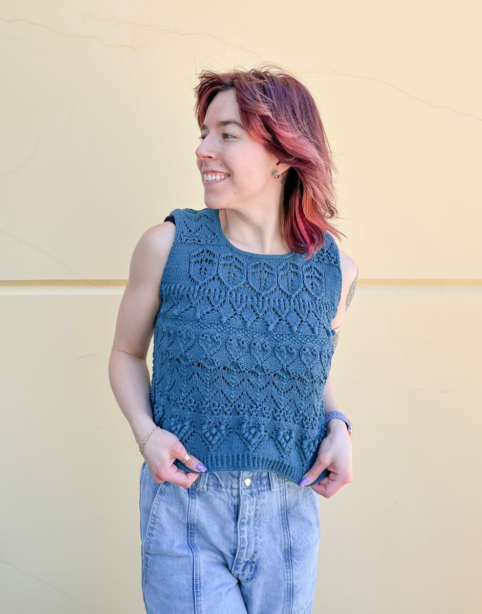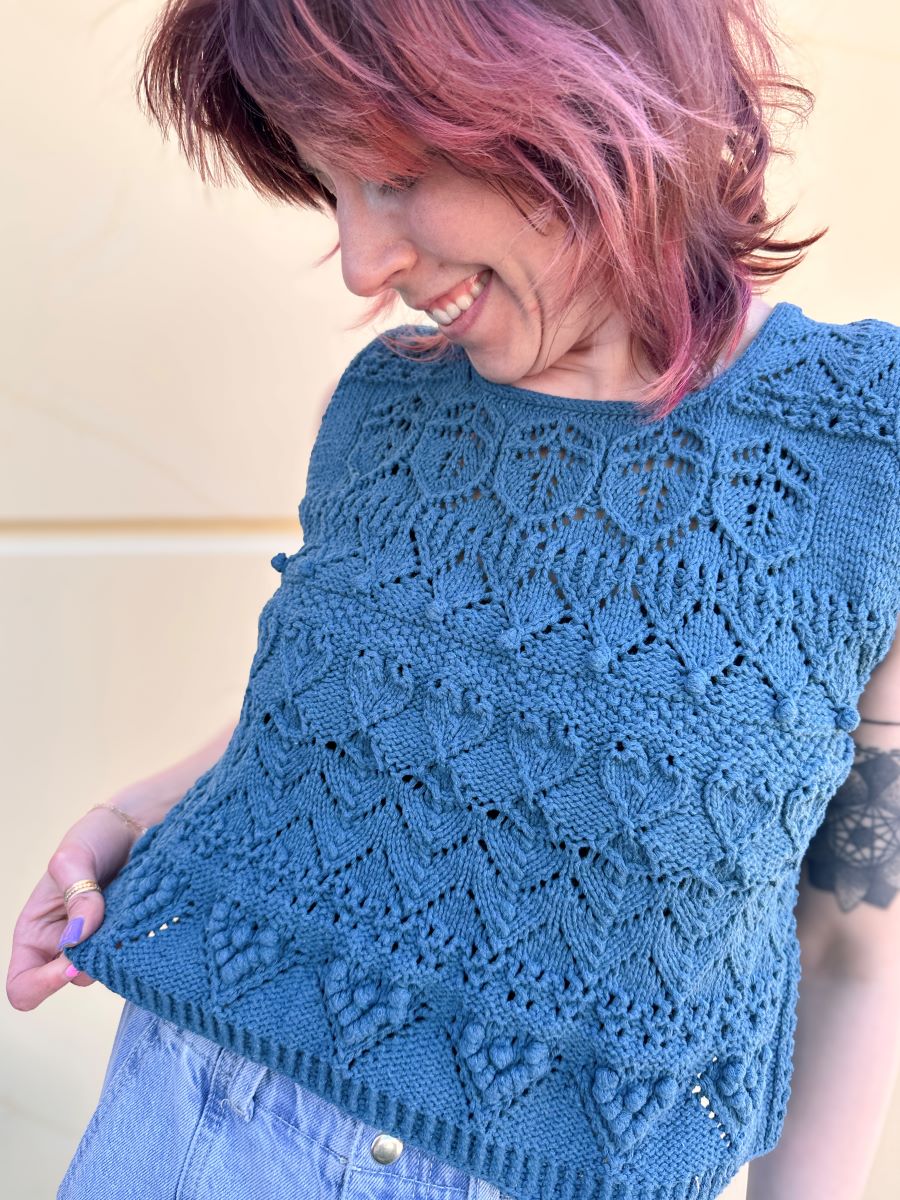 Our Bean Allison is the quickest knitter we know!! She whipped up the Love Letter Top by Veronika Lindberg in Rowan Cotton Revive (color is 008 Ocean!). She says she loved this project because it called for different patterns in each section, which kept it interesting! Allison noted that the pattern suggests a light worsted weight, but she found Scheepjes Catona (fingering) to be a suitable alternative, suggesting just a slightly larger needle. To achieve a sturdier material, Allison held Rowan Cotton Revive double. We're writing all our love letters dedicated to this top because it's perfect for romantic summer nights!