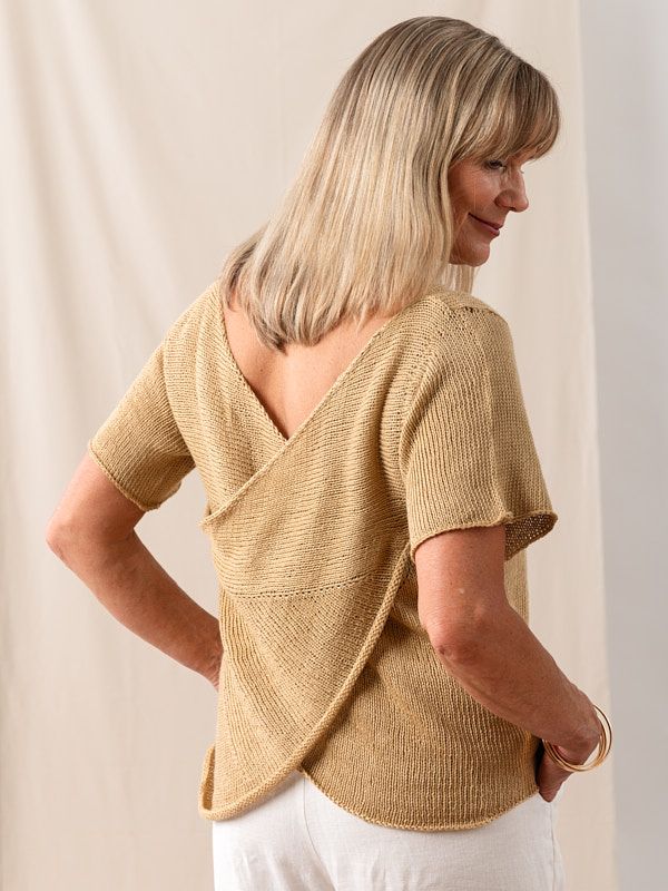 Perse is your classic knit crewneck tee—only better! With sleek lines in the front and eye-catching overlapping back panels, this top brings a fresh twist to everyday style. Knit in Modern Linen, it has an effortlessly drapey feel that’s polished enough to dress up but comfy enough to keep things casual.