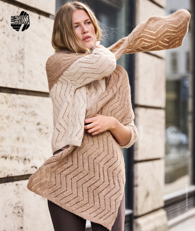 Get all wrapped up in this cozy shawl, designed with a lively zigzag eyelet pattern that dances across the fabric! This playful piece is worked from short edge to short edge, making it a breeze to knit. A delicate ribbed edge adds a stylish finish, while the soft Lana Grossa Natural Lama Fine yarn hugs you in snuggly comfort. This shawl is the perfect blend of texture, personality, and warmth—a must-have for any wardrobe!