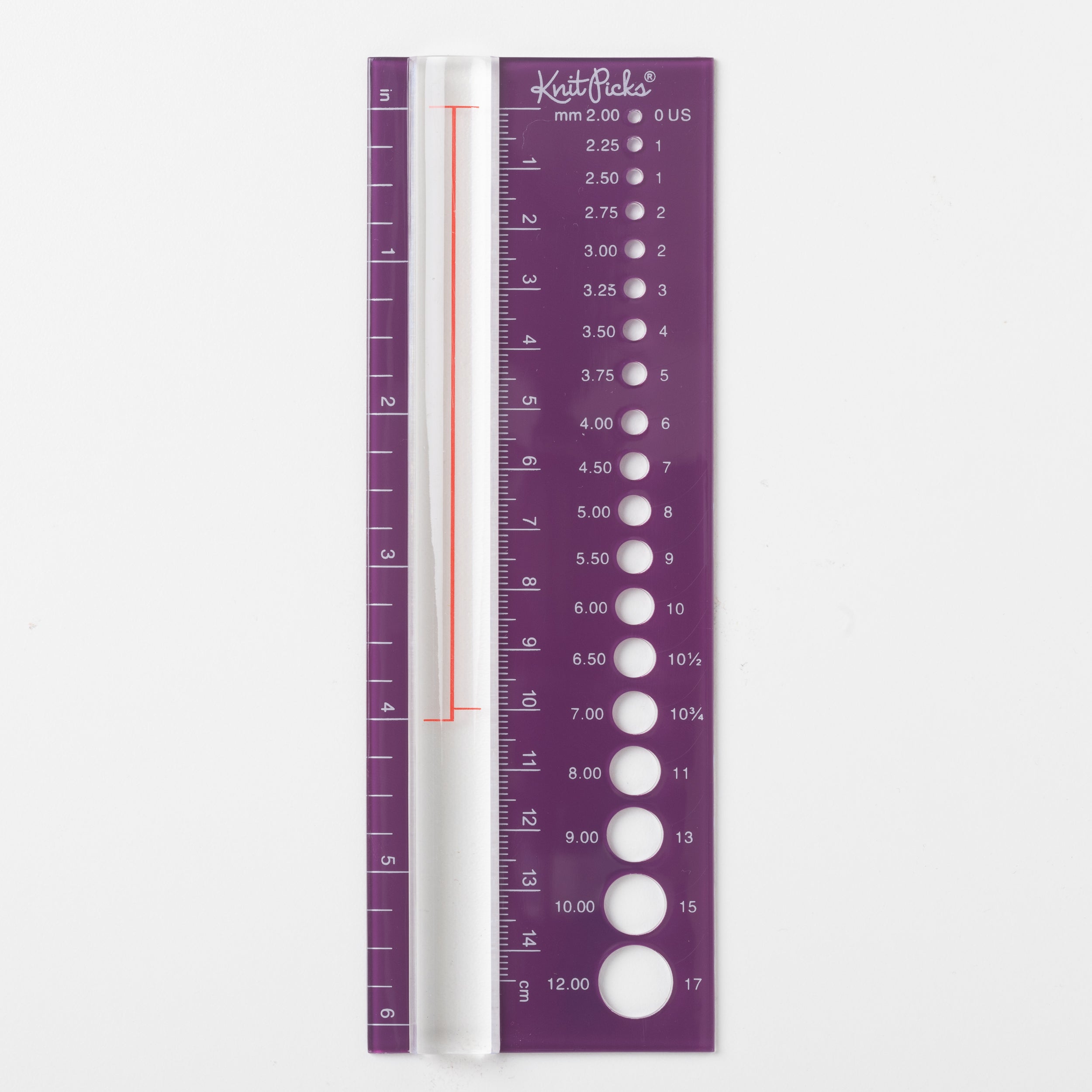 This needle sizer is the perfect compact tool. You can check your needle size, check your gauge, and measure your stitches or rows all with this pocket sized tool. The Knit Picks view sizer can check the gauge of every size of Knit Picks needle, from US size 0 (2 mm) to US size 17 (12 mm). There is also a six inch ruler, and a magnifying section to measure your gauge.