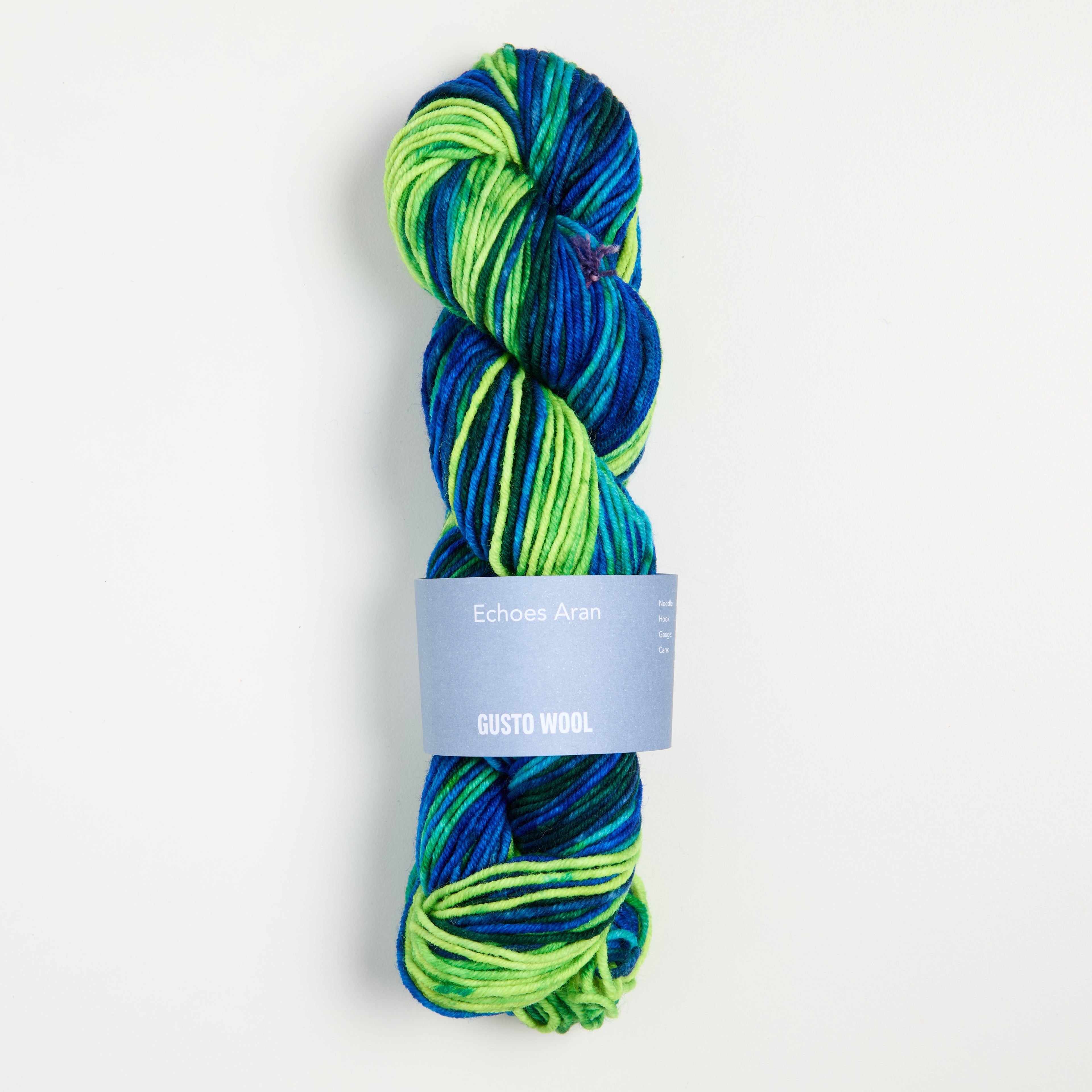 Gusto Wool Echoes Aran takes the self-striping Echoes sock yarn you love and bulks it up for projects that will keep you warm and toasty. Knit or crochet stunning scarves, hats, sweaters, and more with this beautiful hand-dyed superwash Merino wool.