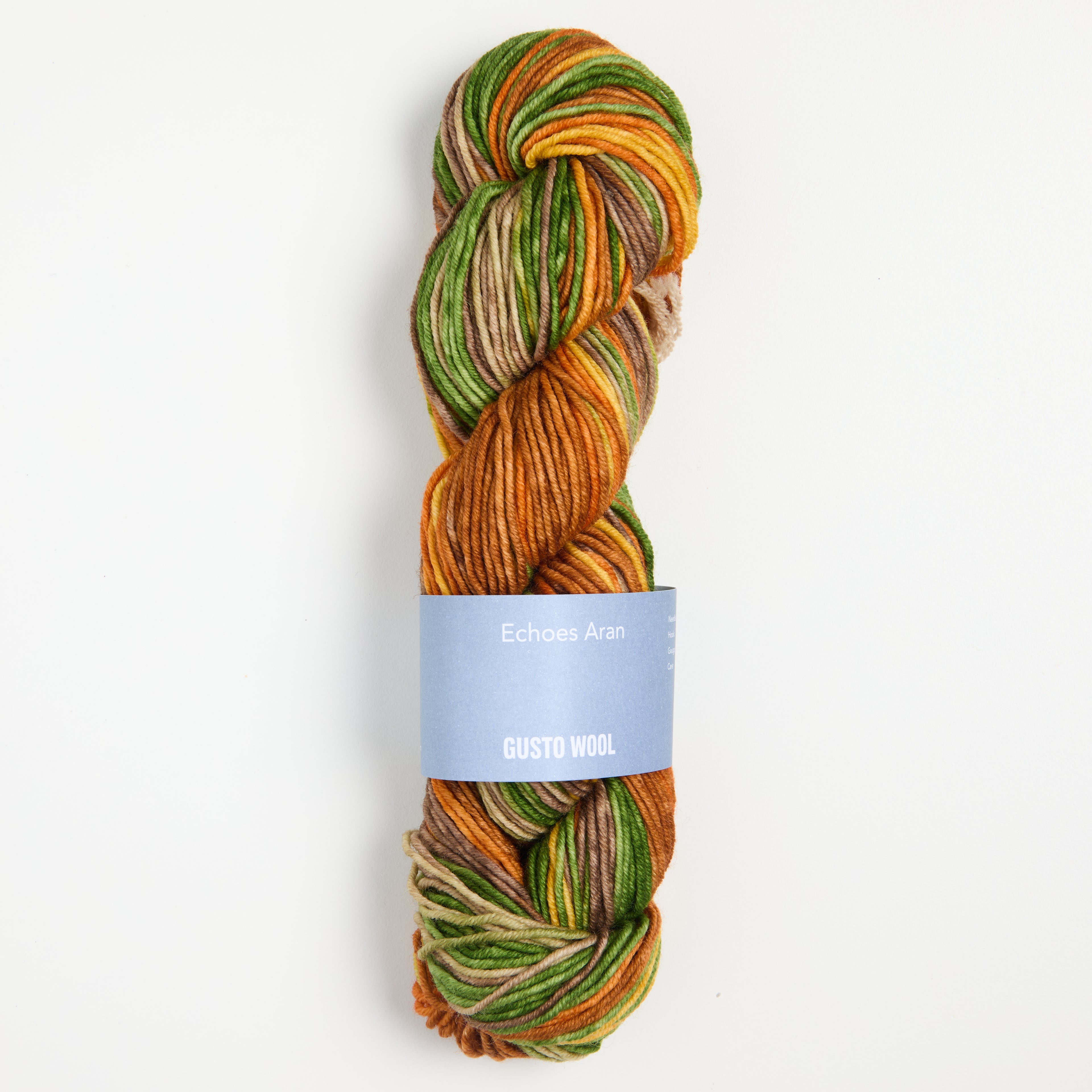 Gusto Wool Echoes Aran takes the self-striping Echoes sock yarn you love and bulks it up for projects that will keep you warm and toasty. Knit or crochet stunning scarves, hats, sweaters, and more with this beautiful hand-dyed superwash Merino wool.