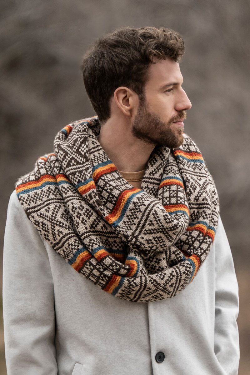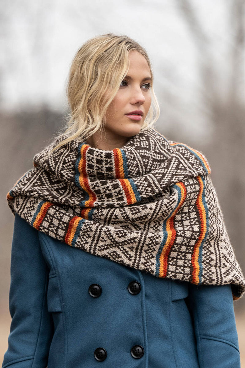 A stunning double-wrap cowl featuring intricate colorwork with pops of bright stripes. Includes 7 total hanks of Blue Sky Fibers Woolstok (2 hanks of colors A and B, 1 hank each of colors C, D, and E).