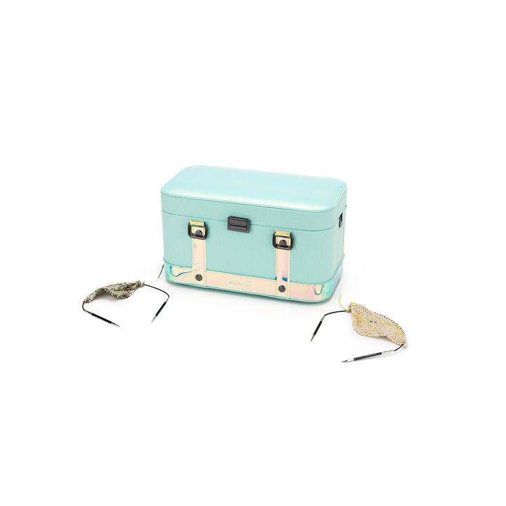 Feed your yarn smoothly through the side openings while knitting or crocheting on the go, open or closed! Inside, a magnetic lid holds your pattern and notions, while a removable tray keeps essentials organized. With snap-off handles, a crossbody strap, and a built-in D-ring for accessories, this case is ready to travel in style.