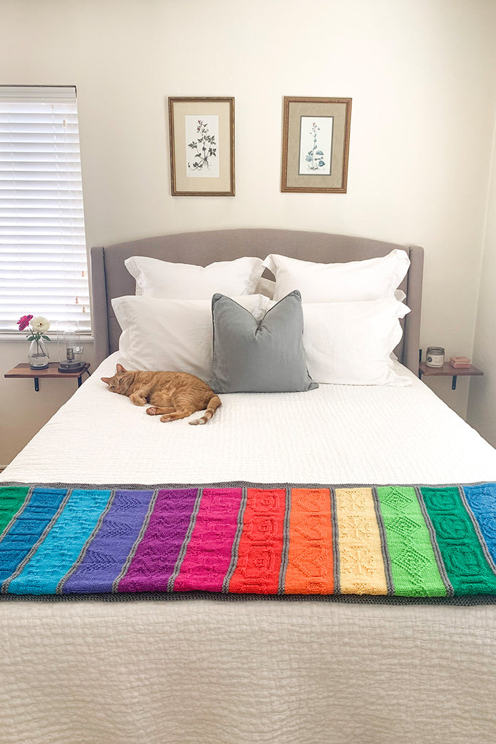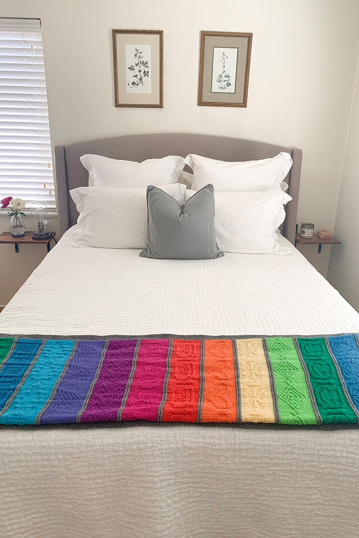 To help us celebrate our 20th birthday, our friends at Cascade created a BIG surprise! The Cascading Rainbows Blanket features 10 specially dyed colors to match our logo! You can find subtle motifs throughout the stripes that tell the story of our relationship with Cascade and the history of Jimmy Beans Wool! From adorable fluffy sheep to the tall trees of Truckee, the pattern of this blanket has it all!