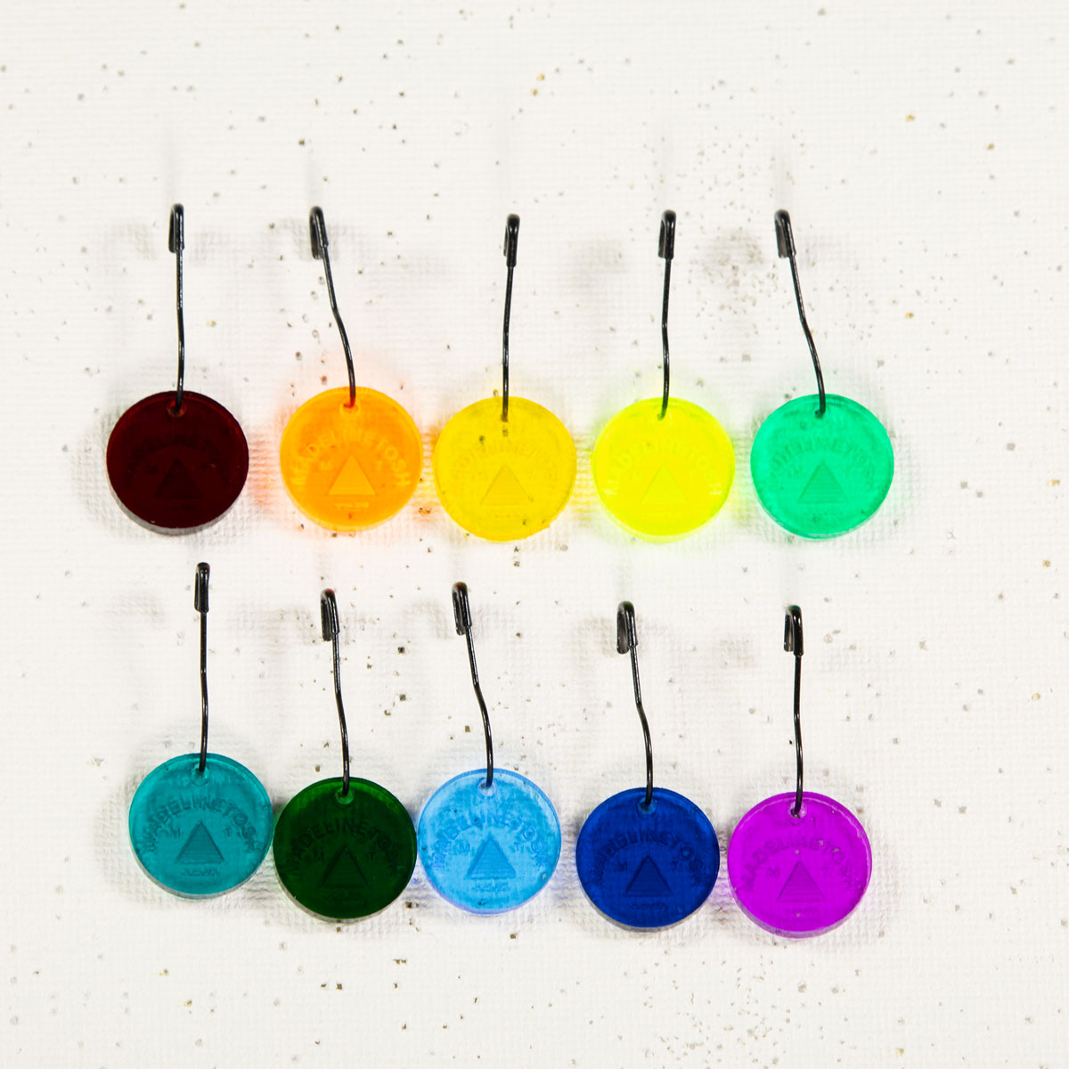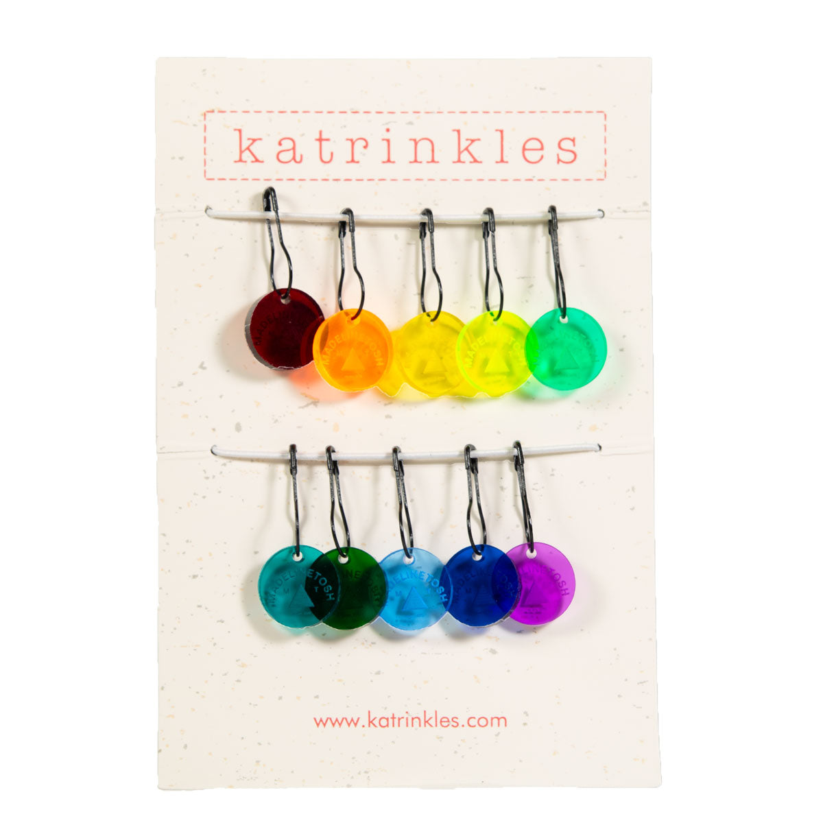 Rainbow 10-pack of limited edition Katrinkles stitich markers in collaboration with Madelinetosh.