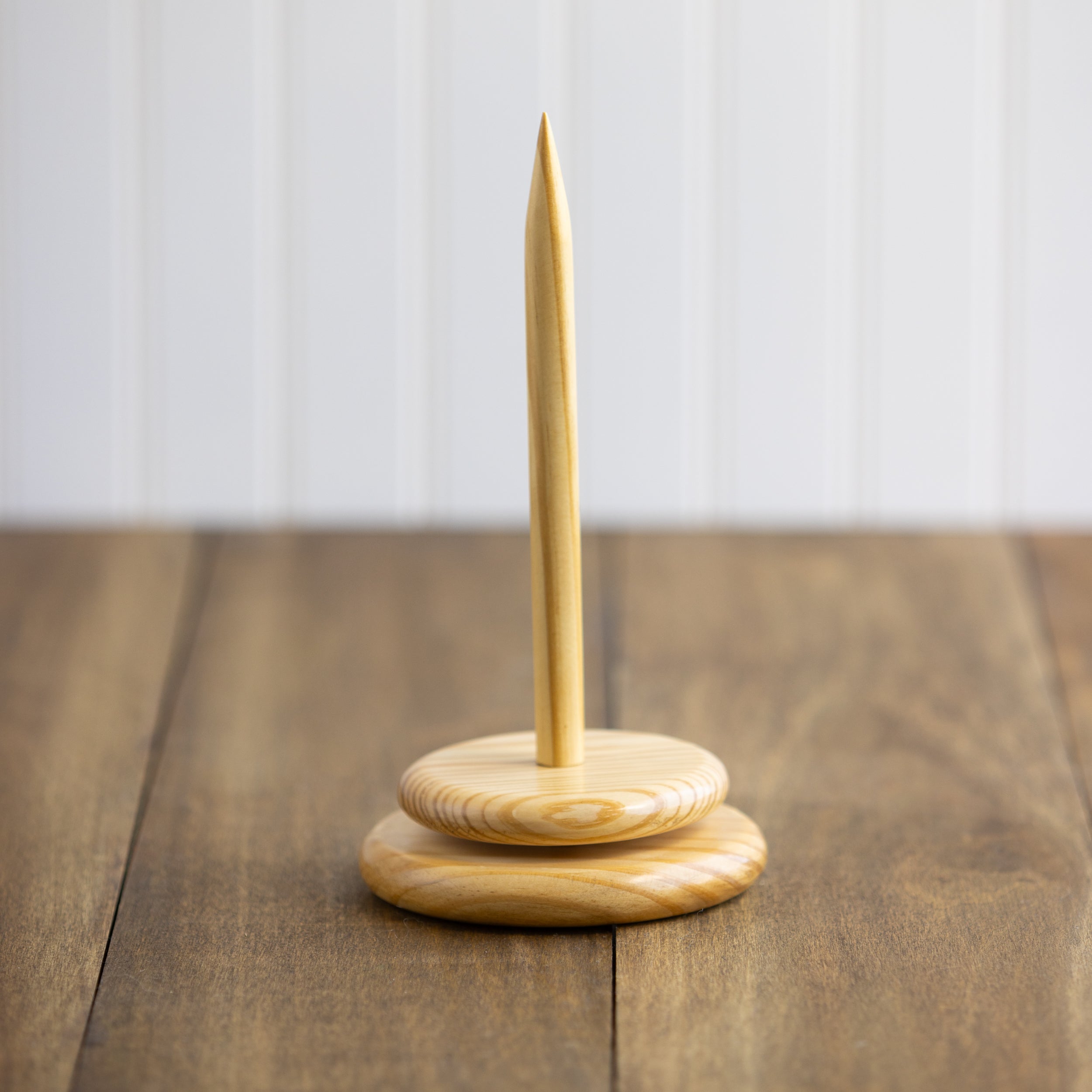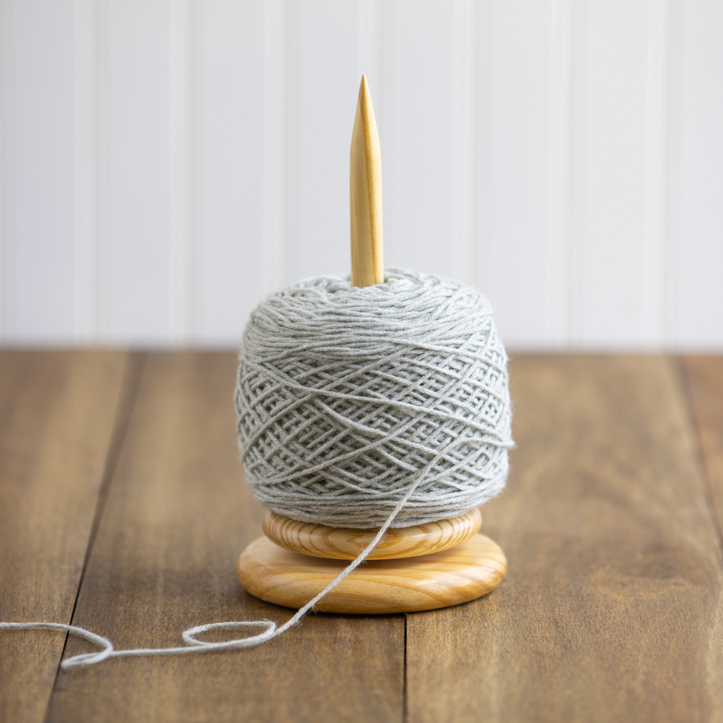 Keep your yarn clean and tidy with this solid pine spindle! Your yarn cakes will fit snugly on the spike as the lazy Susan base keeps your fibers flowing smoothly. Simply skewer a donut skein or cake and work from the outer yarn. The spindle will smoothly turn on its base, neatly releasing yarn as you knit. In addition to working well with a single yarn, it holds two 100gm cakes stacked with ease, perfect for knitting projects with yarns held double without tangling.