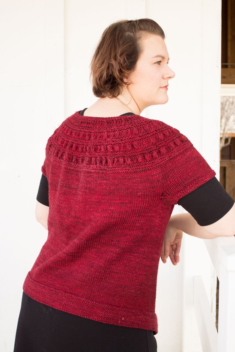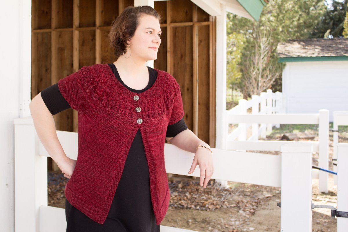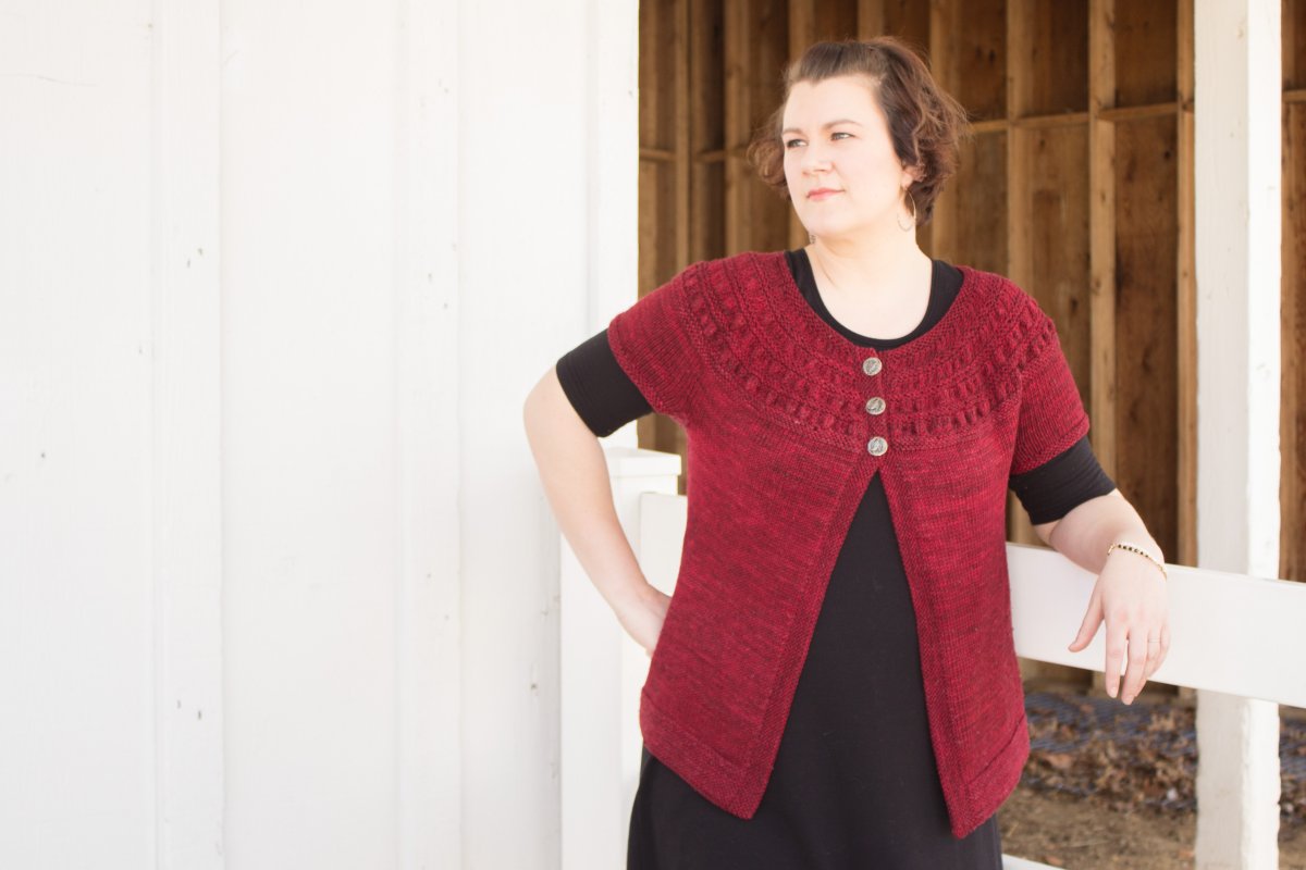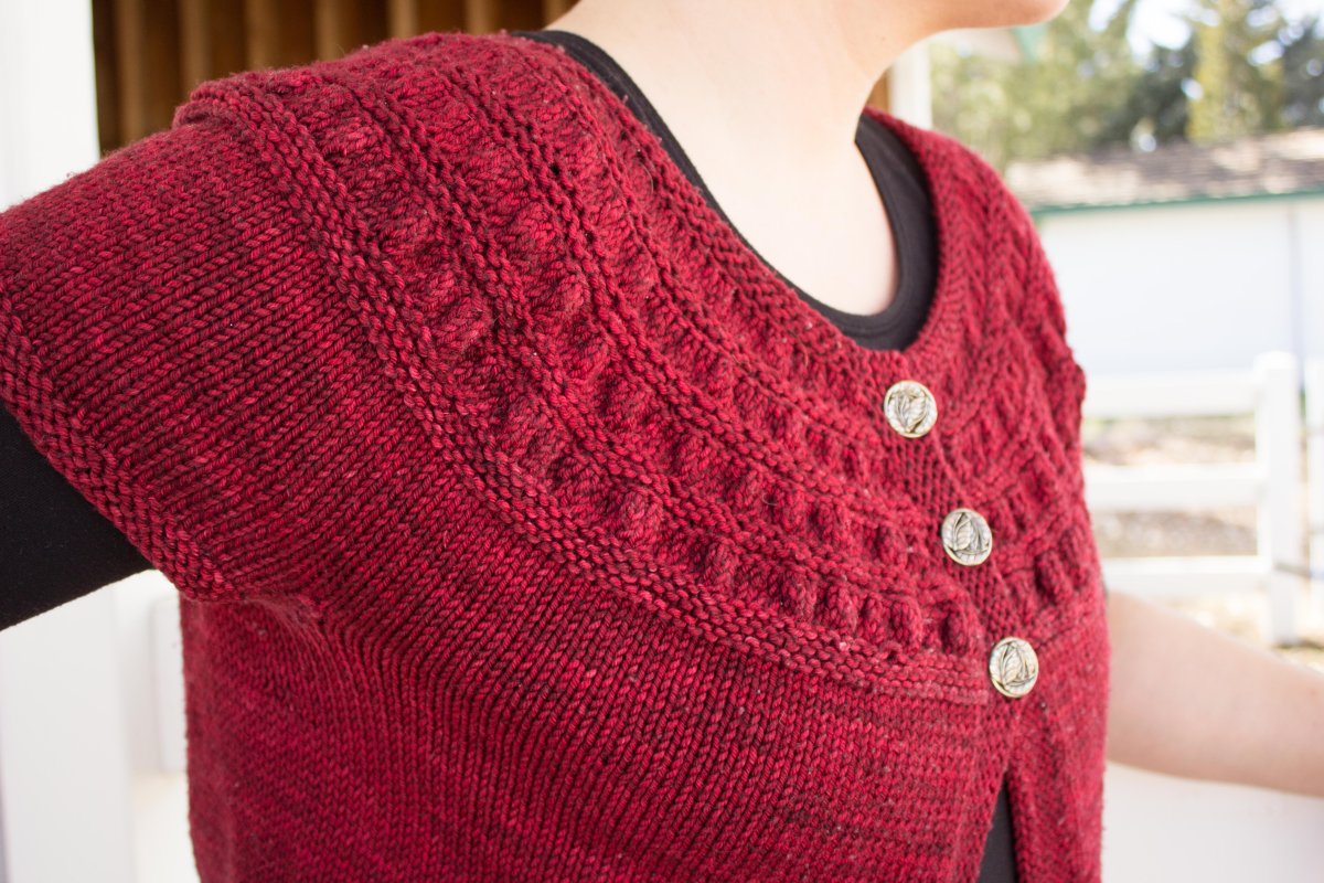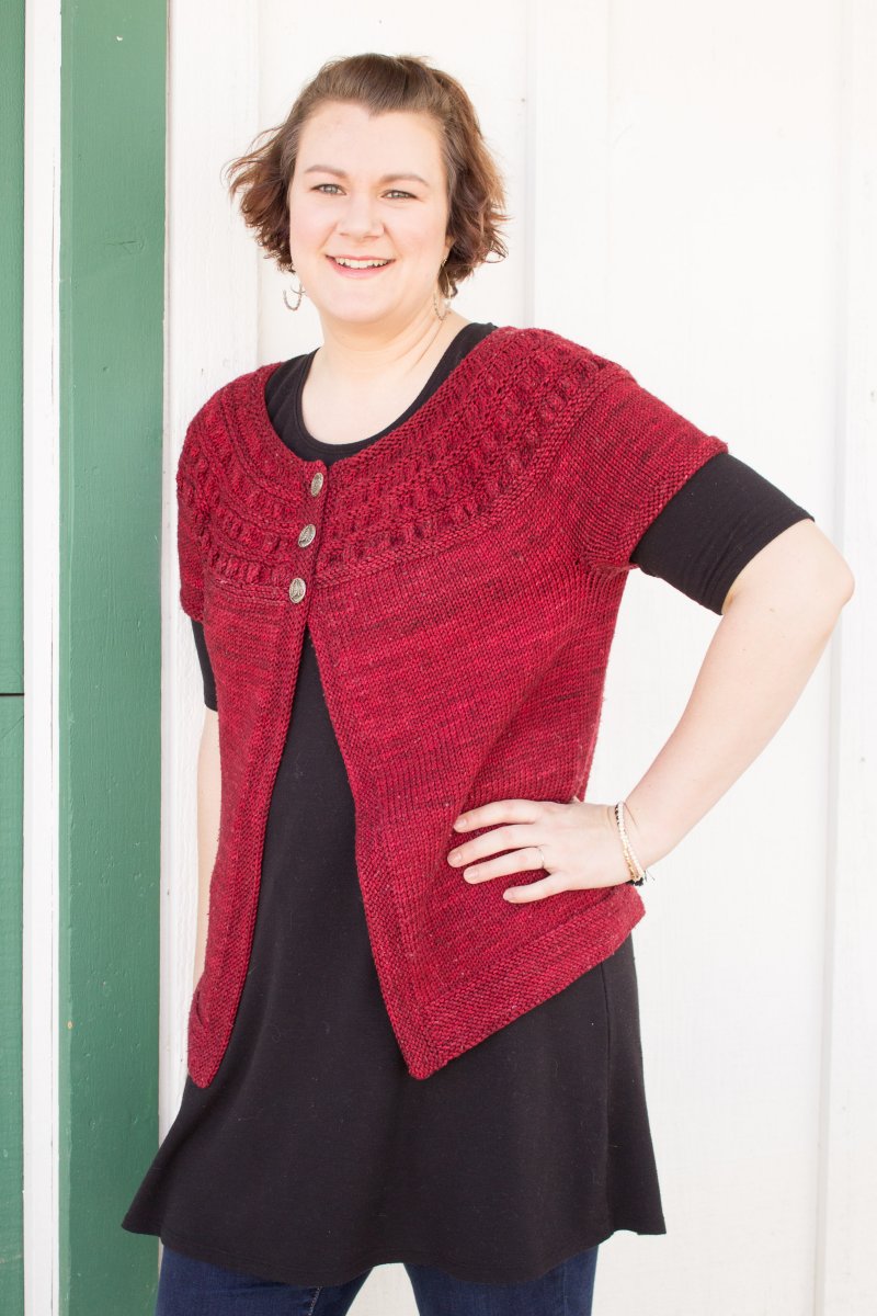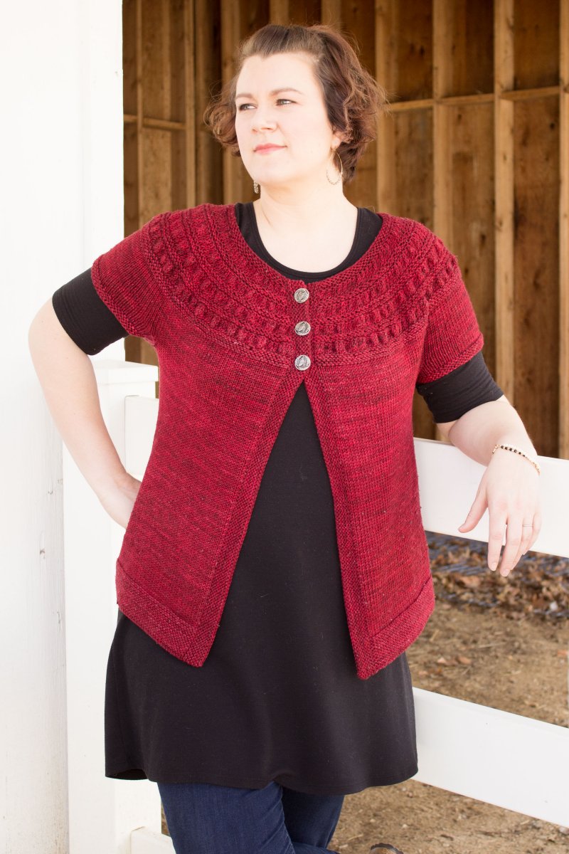 I loved this Tea Leaves Cardigan since we first got the pattern in stock and I knew I had to make it! I finally settled on Tosh Vintage in Tart. The pattern calls for the Tosh Merino but since we don't carry it, and the Vintage is the same gauge, I figured it would work perfectly! I am so thrilled with the end result, except the pattern does run a tad bit big. I made my exact size and swatched, but I would have liked a closer fit. I am already planning a second one, so I'll know what size to make for next time! I finished this in a hurry while at Stitches because I wanted to wear it at our Stitch Red booth, but I will go back soon an finish making the sleeves the suggested length. I am also planning to sew in a reinforcement chain stitch on the inside of the collar to snug it up a bit. Because it's a bit big, it's also a bit large in the neck. All in all, I am so happy with the result! The yarn is gorgeous and the fit is flattering (even if a little large). I would definitely recommend this pattern to others.