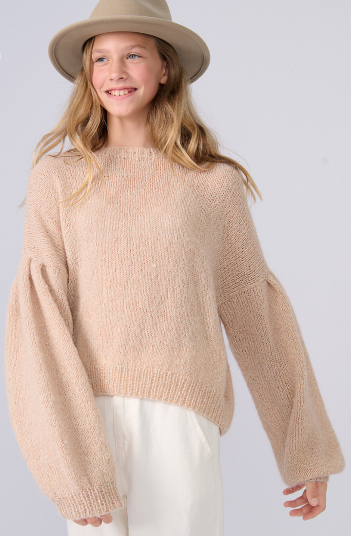 Perfect for twirling, playing, and staying cozy, this dreamy balloon sleeve sweater is a must-have for any little fashionista! Made with the soft and airy blend of Lana Grossa Soffio & Setasuri, it feels like a warm hug on chilly days. The smooth stockinette stitch gives it a sleek and comfy feel, while the ribbed cuffs and trim keep it snug in all the right places. With its relaxed drop shoulder, playful puffy sleeves, and lightweight warmth, this sweater is sure to be a favorite for every adventure—big or small!
