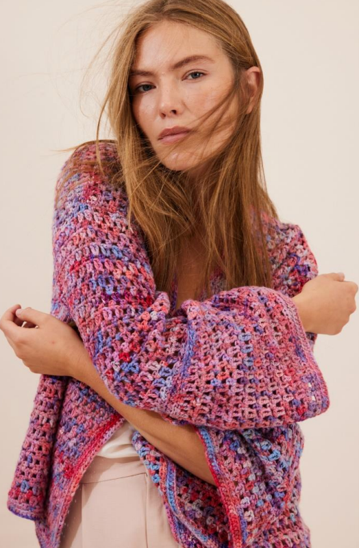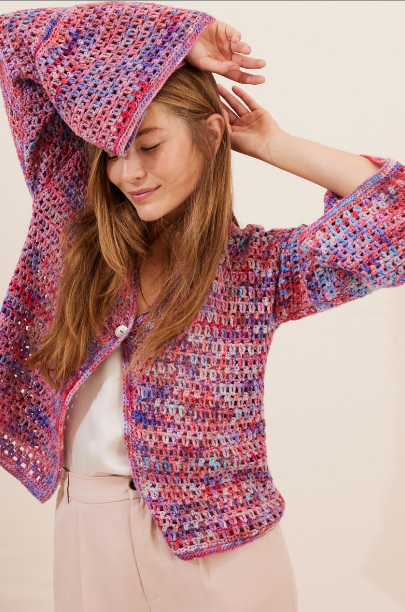 This crocheted V-neck cardigan, made with the vibrant Lana Grossa Cotonella Multi, is the perfect blend of cozy and chic! The one-button closure adds a simple yet stylish touch, while the bell sleeves bring a whimsical, retro-inspired vibe. The multi-colored yarn creates a beautiful, textured effect that adds depth and dimension to this classic piece. Whether you're layering it over your favorite tee or dressing it up for a night out, this cardigan adds a pop of color and effortless style to any outfit!