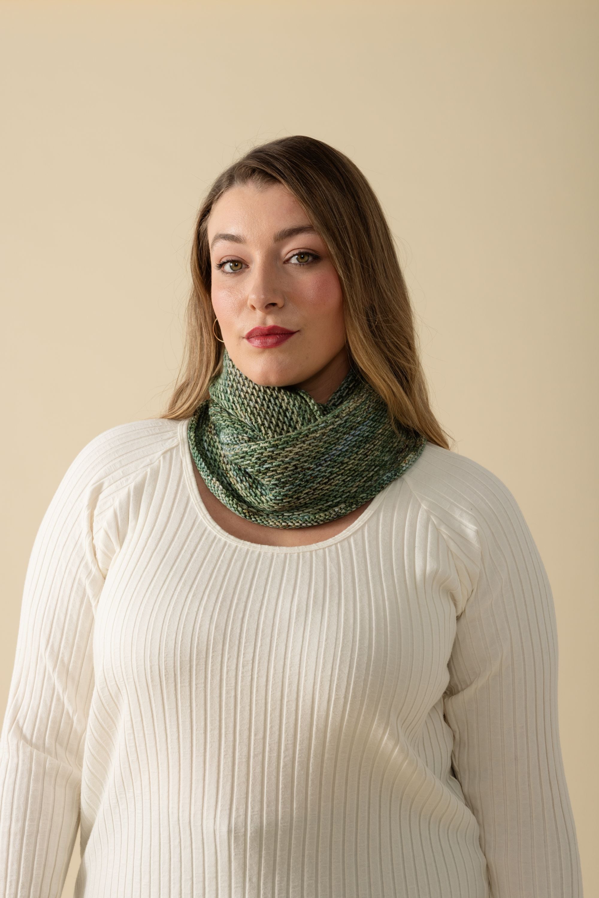 Hello Cowl is the perfect bright pop of color and a warm hug around your neck. The cowl is knit in the round using knits and purls to create an accordion effect. The PDF pattern is included for free with the kit.