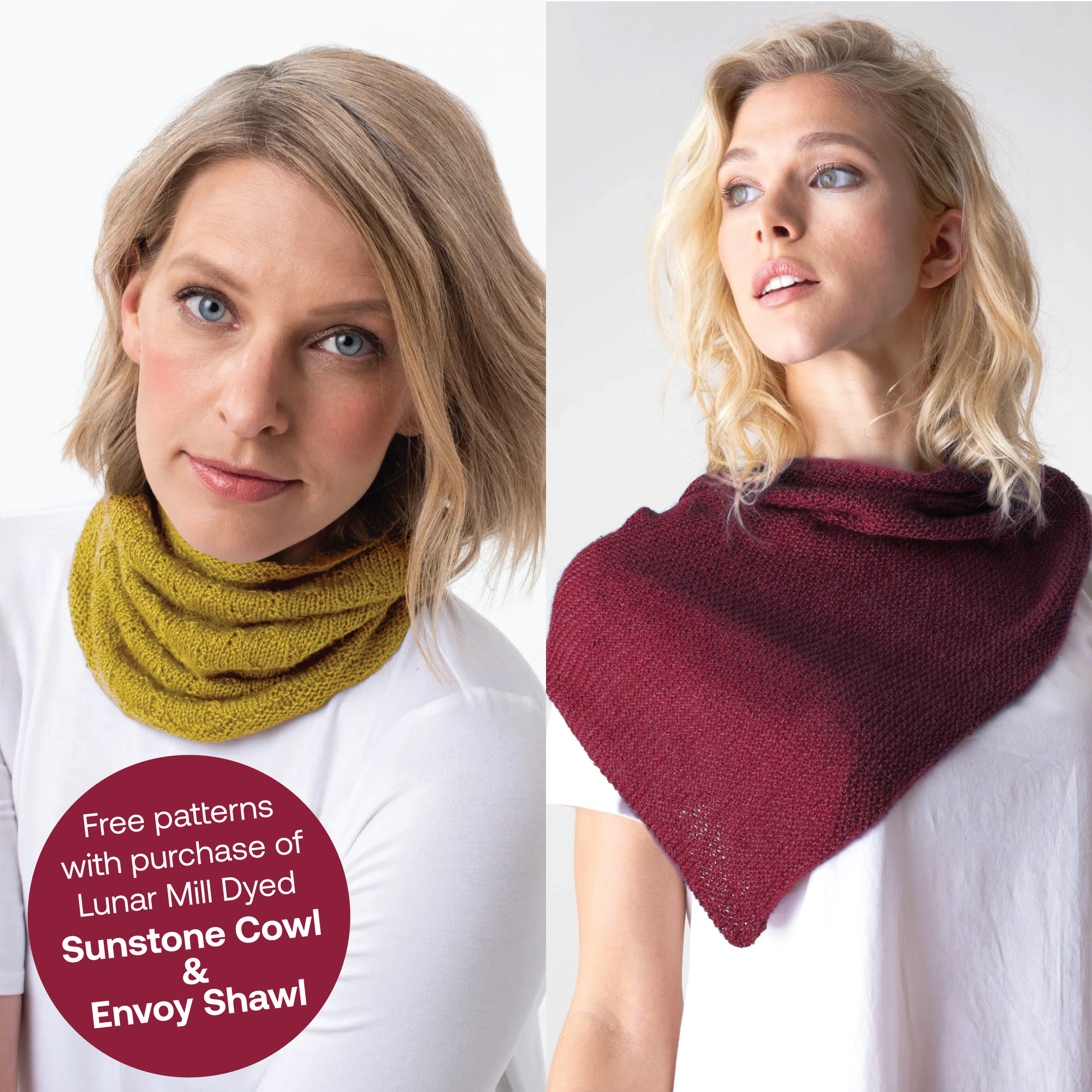 Get the Sunstone Cowl and Envoy Shawl patterns free with any purchase of Tosh Lunar Mill Dyed! Each pattern calls for 1 hank of Tosh Lunar Mill Dyed.
