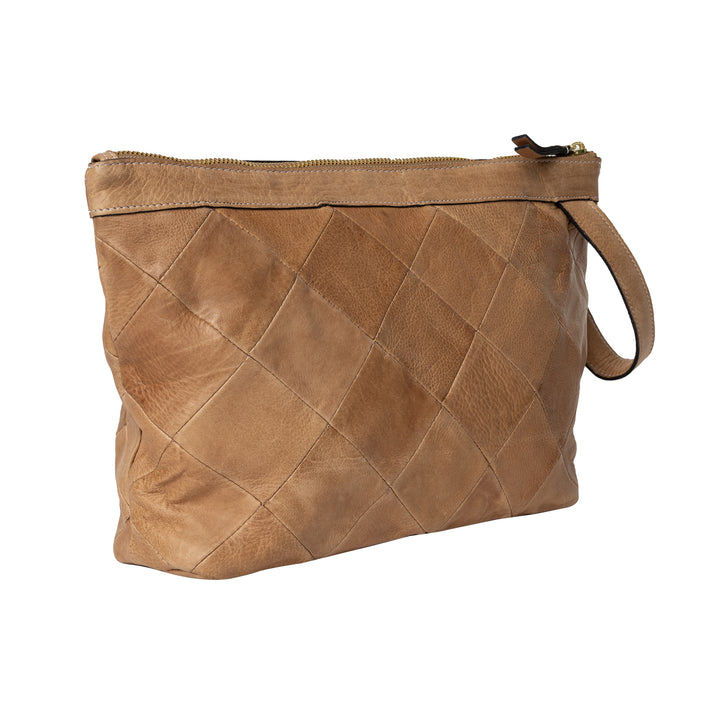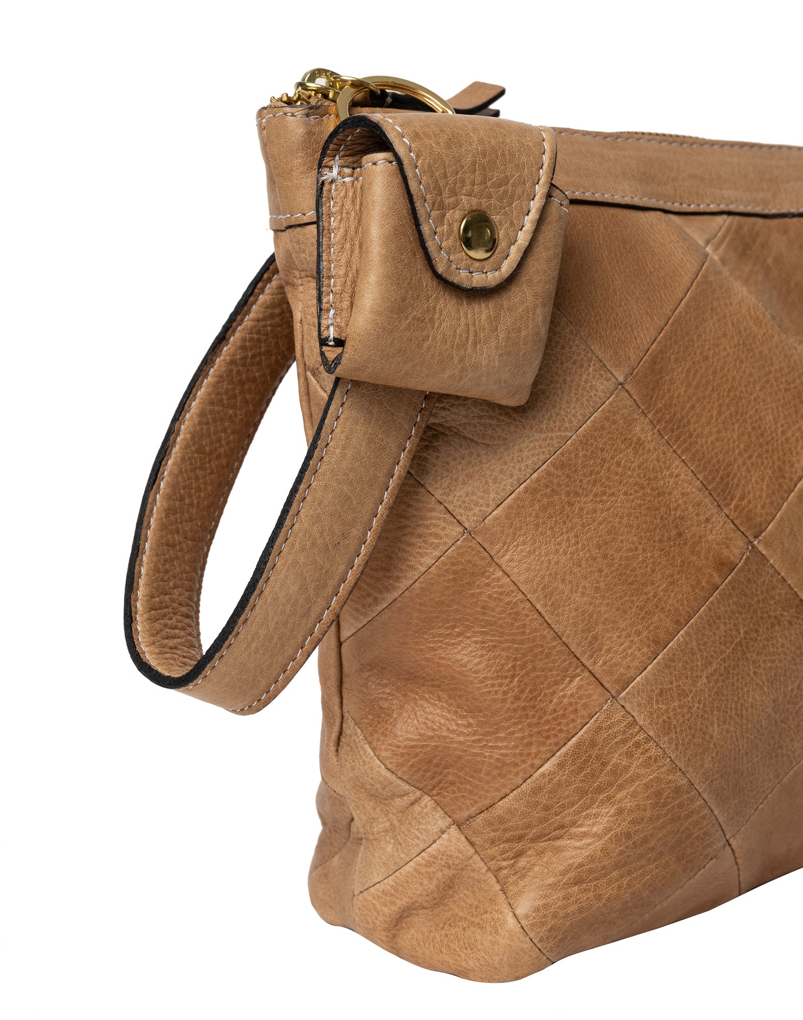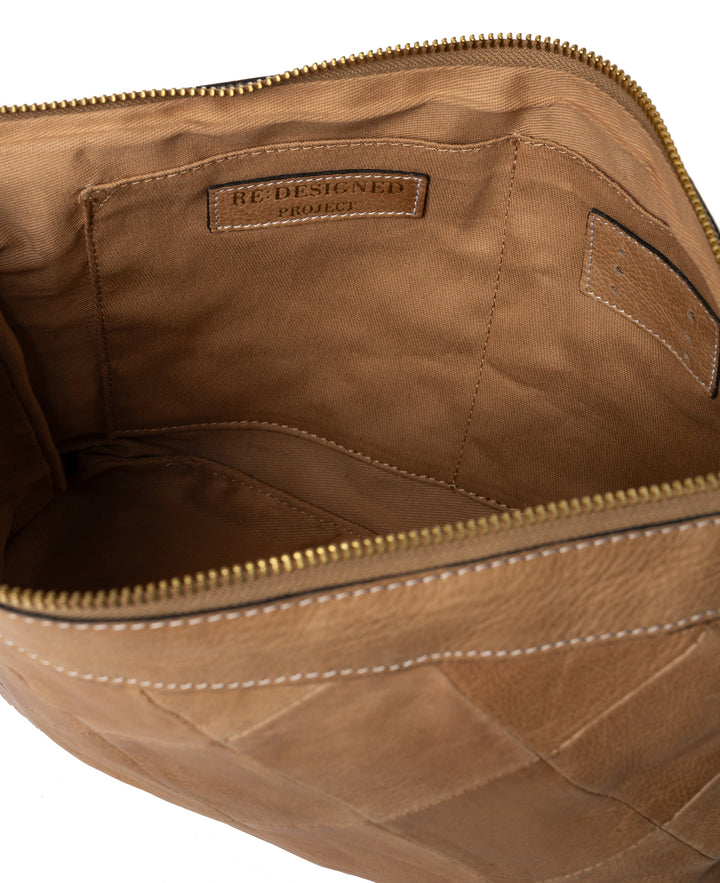 Dive into sustainable luxury with Project 17, a spacious clutch pieced together from scrap leather to form a stunning quilt pattern! This bag offers ample space for a small project, yarn skeins, and all your making essentials. Inside, you'll find four deep pockets perfectly sized for needles and accessories, complemented by a sleek metal zipper to keep everything organized and secure. Its got a handy side handle and a cleverly designed keyring for your measuring tape, too! Made in Urban quality naturally colored cow leather, each clutch boasts a unique pattern, dyed and lightly waxed by hand for a soft, natural finish.