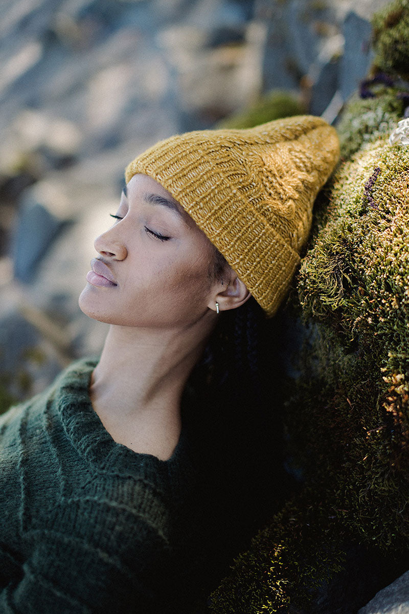 This cabled masterpiece utilizes different sizes of cables to keep you (and your needles) on your toes, creating varied shapes and textures fit to keep your noggin cozy! This hat is worked in the round from the brim up, with one size fitting most adults.