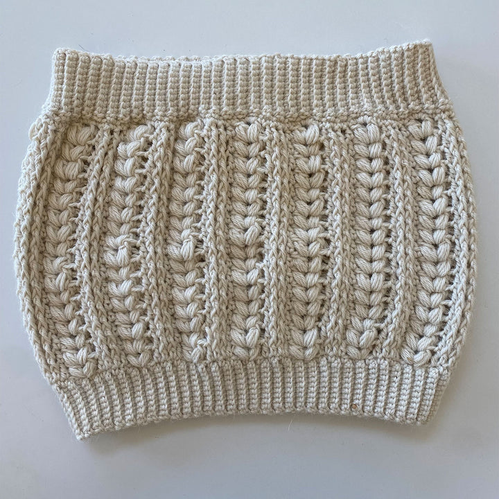 - Shown in Yarn Citizen Harmony DK in the color Natural. Three skeins required.